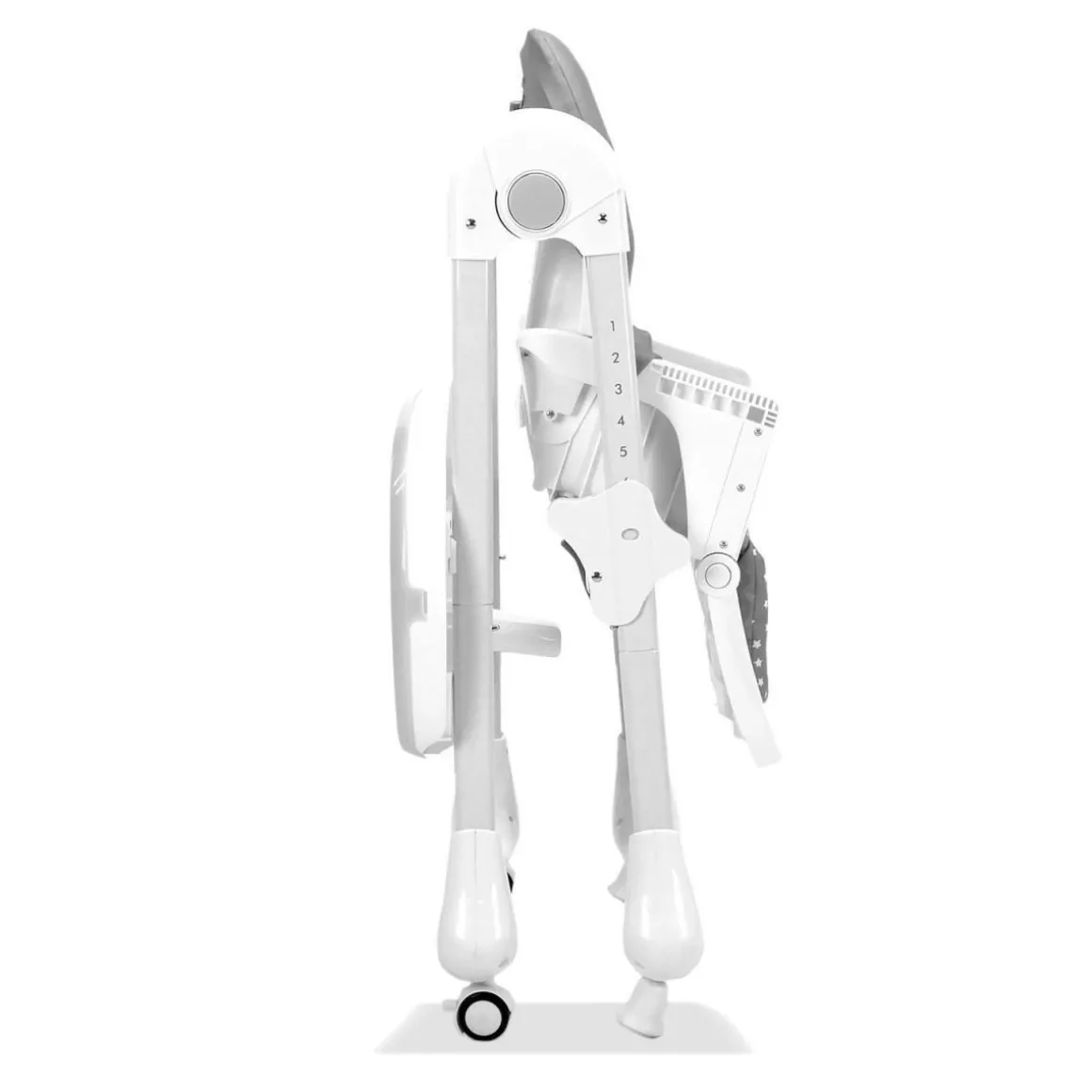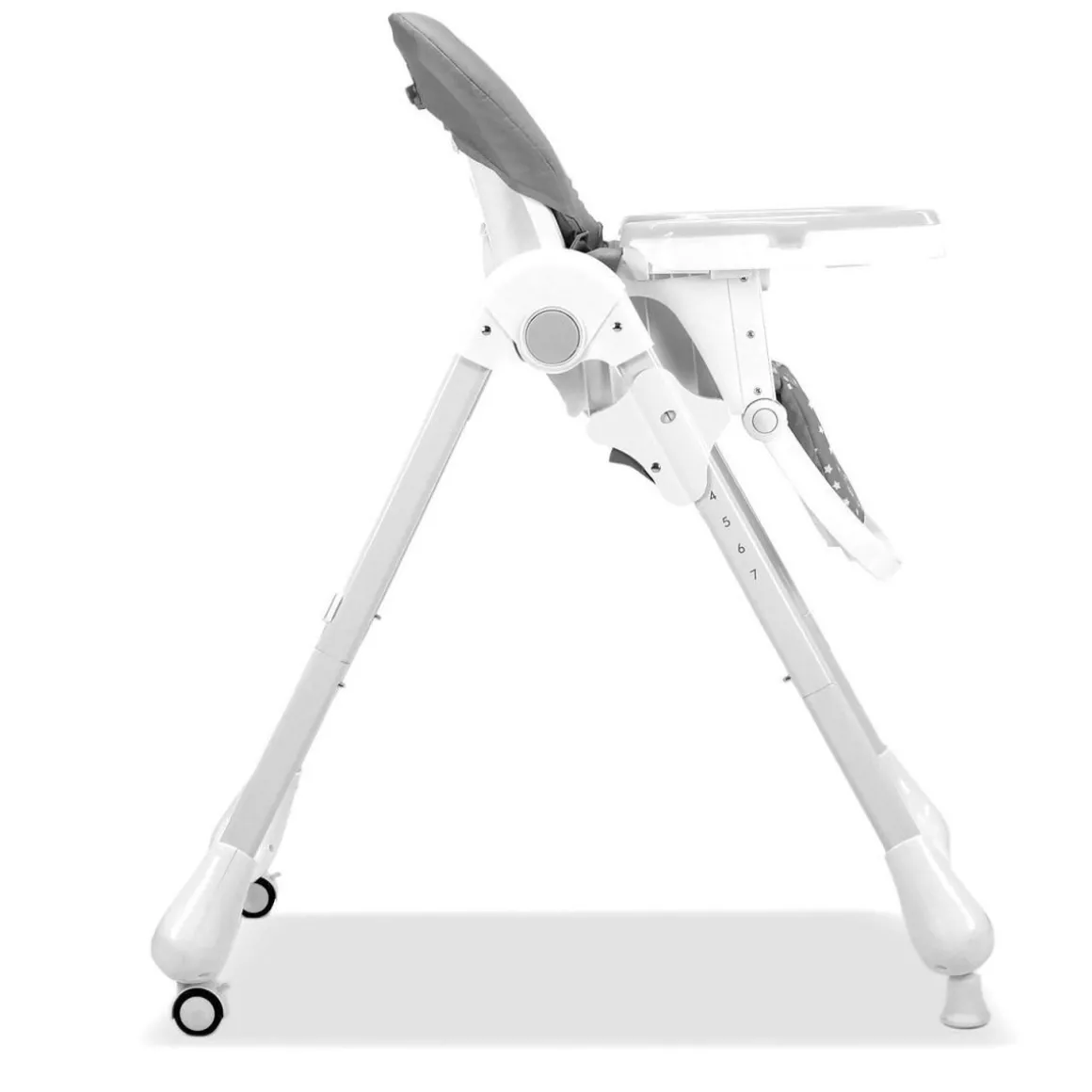 Hauteur réglable en 7 positions. Tissu rembourré amovible et lavable. Système de pliage facile. Repose-pieds réglable. Dossier réglable en 3 positions. 2 roues pour un transport facile. Grand bac à nourriture avant double, réglable et amovible