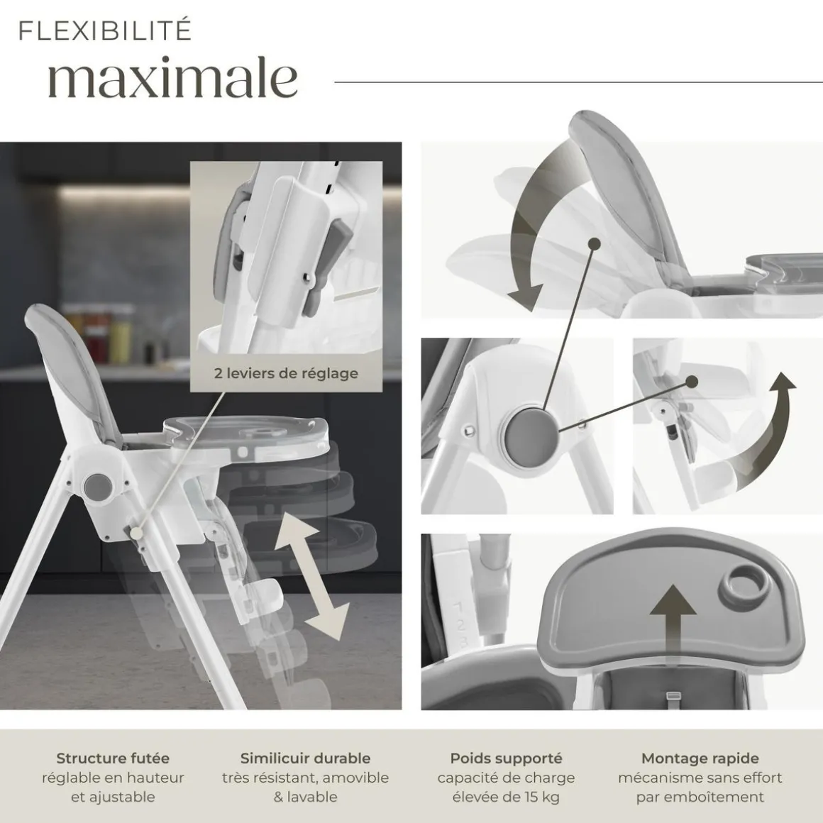 Le design flexible permet d’ajuster le repose-pieds, le plateau ainsi que le dossier en trois positions différentes. Ainsi, votre enfant peut toujours s’asseoir confortablement et manger en toute sécurité. De plus, la chaise se plie facilement et se range de manière compacte – idéal pour les familles qui aiment voyager.