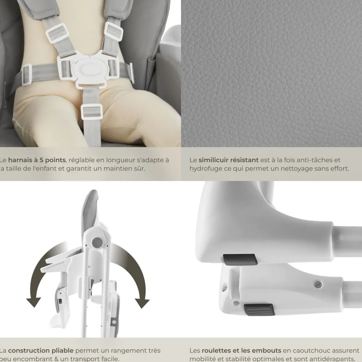 Grâce à son cadre en acier solide, la chaise haute garantit une capacité de charge élevée et assure une stabilité maximale avec ses pieds antidérapants. Le harnais intégré à 5 points est réglable en longueur et offre un maintien fiable de sorte que votre enfant soit toujours protégé.