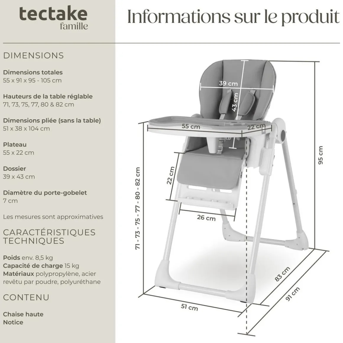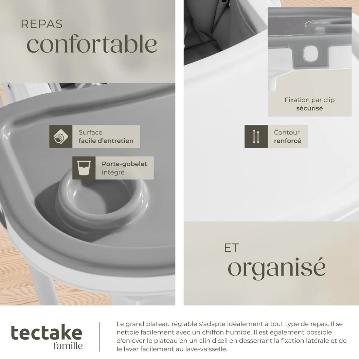 La chaise haute Sophia de tectake est le compagnon idéal pour les petits explorateurs dès les premiers mois de vie. Grâce à son réglage en hauteur sur 6 positions, elle s’adapte de manière flexible à la croissance de votre bébé et lui offre une position assise confortable à chaque repas.