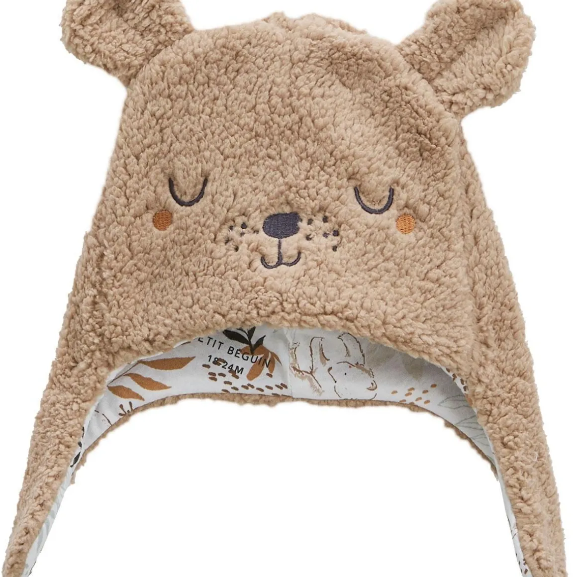 Beaucoup trop mignon ! Ce bonnet à oreilles et ces petites moufles en sherpa sont le must-have de cet hiver et des températures basses. Aux petites filles comme aux petits garçons, il ira à ravir grâce à sa jolie couleur camel. Produit labellisé STANDARD 100 by OEKO-TEX ® (BJ020 189402 TESTEX) Des petites griffes sur les moufles : trop chou Tout en sherpa Des oreilles en relief trop craquantes Un bel imprimé à l’intérieur