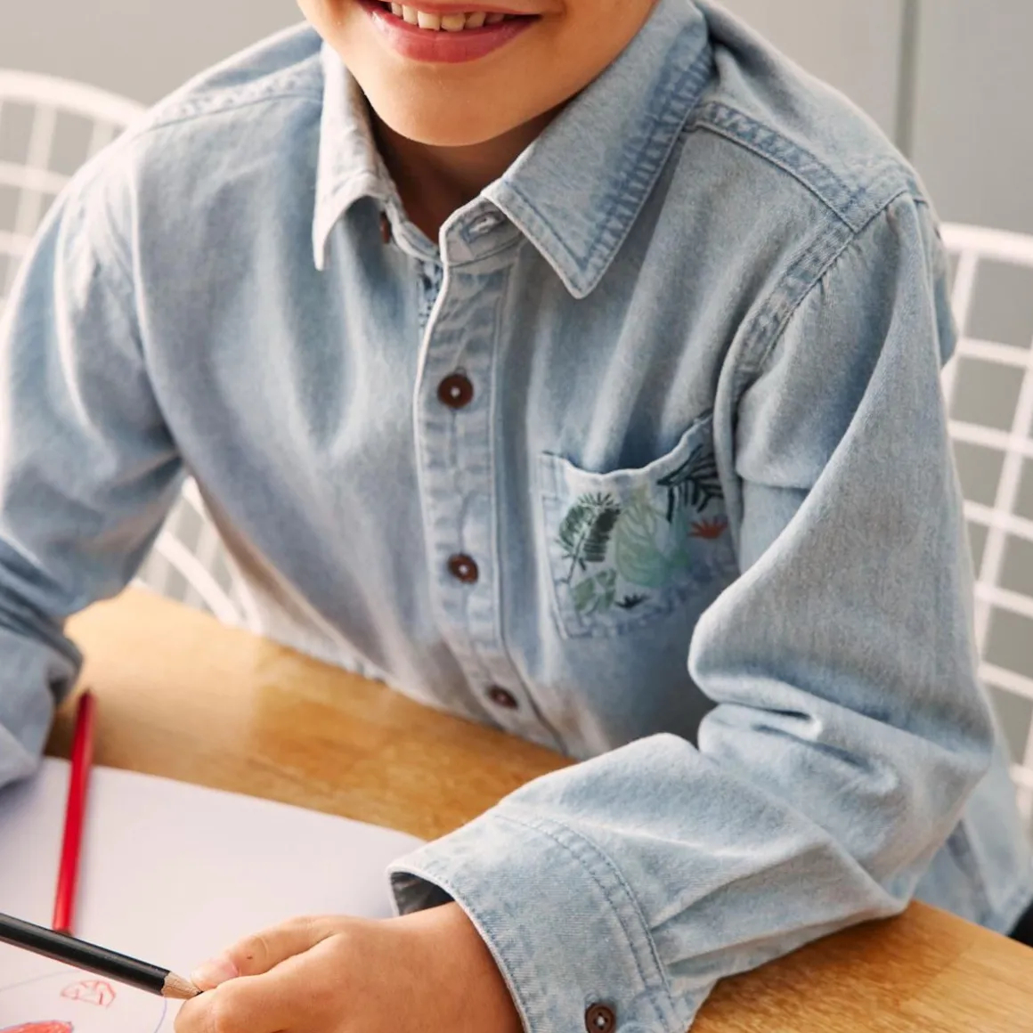 Découvrez cette jolie chemise en denim clair pour compléter un look automne-hiver. Les détails tendances ? l’imprimé sur la poche que l’on retrouve également sur la pâte de boutonnage. De quoi vous faire craquer. Une petite poche imprimée En matière denim ultra tendance
