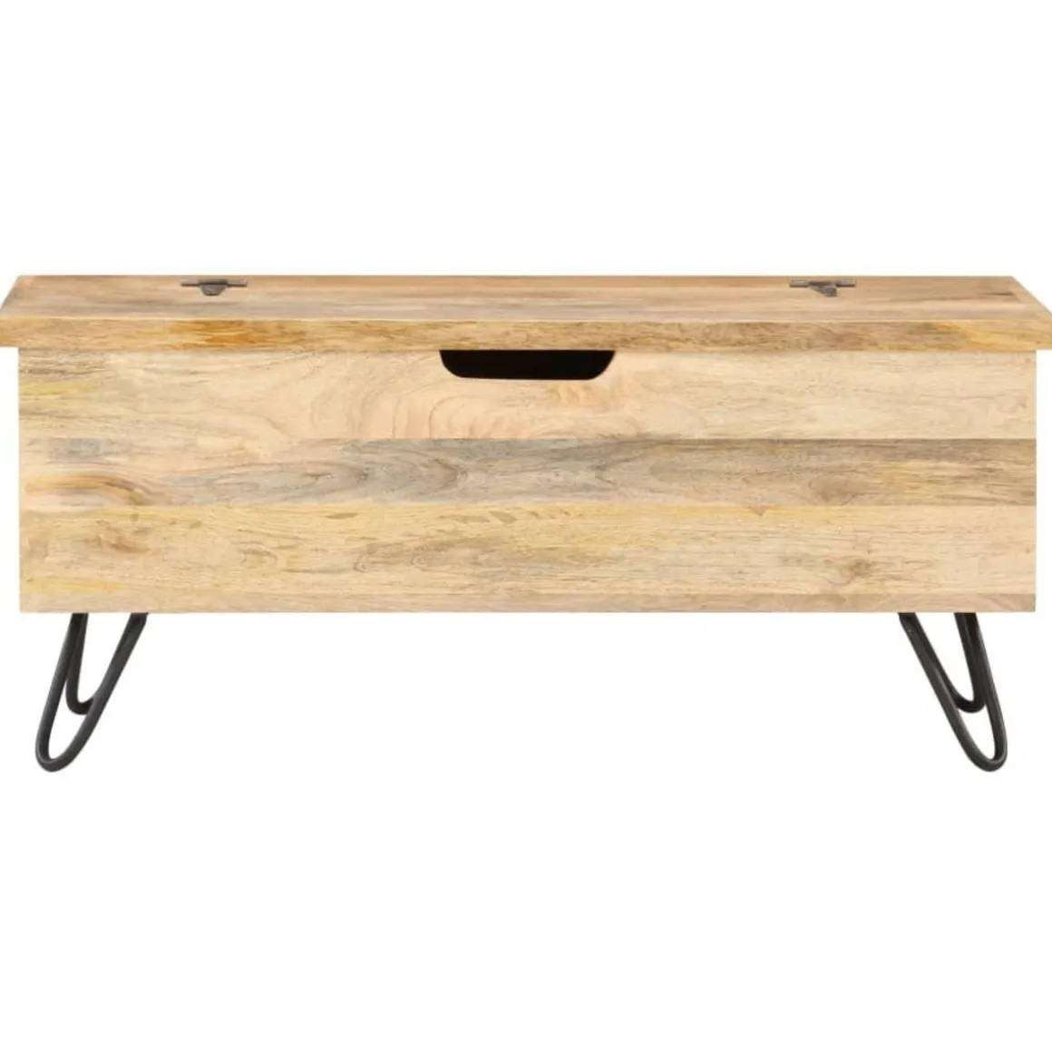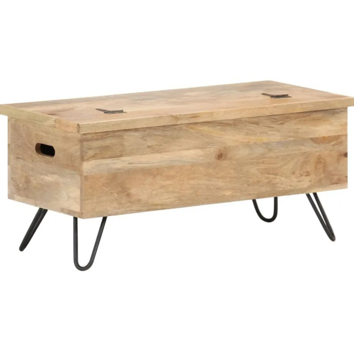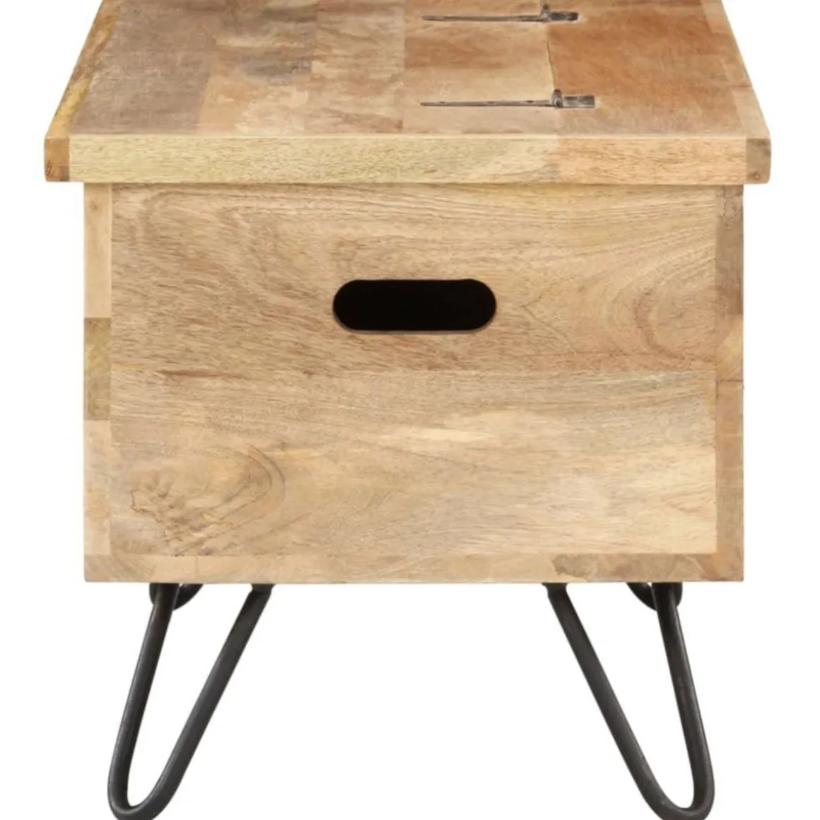 Le coffre est fait de bois de manguier massif, un bois dur tropical avec la force de soutenir le poids. Il resiste egalement a l’usure du temps, ce qui le rend stable et durable. Les pieds en acier offrent une stabilite supplementaire. Cette boîte de rangement, avec un dessus plat stable, peut egalement etre utilisee comme banc d’entree. Le savoir-faire artisanal et les belles veines du bois rendent chaque meuble unique et legerement different l’un de l’autre.