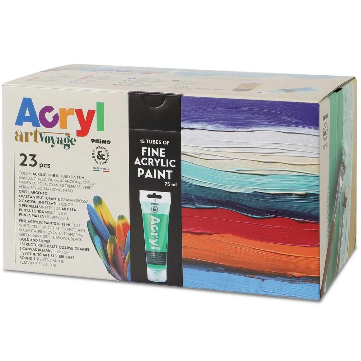 Coffret d’artiste avec peinture acrylique fine en tube de 75 ml. Contenu : 15 couleurs, 1 pâte de structure à gros grains, 2 cartons entoilés 18 x 24 cm, 5 pinceaux: rond 5,8 , plat 6,10,18. Peinture très pigmentée à base d’eau, très couvrante. Elle est facile à étaler, agréable au toucher et résistante, les couleurs sont vives et lumineuses. Elle peut être fixée avec un vernis acrylique afin de lui donner plus de résistance, durée et luminosité. Elle est compatible avec les autres produits à l’eau de la gamme Morocolor. Nettoyer les taches sur textiles tout de suite, car une fois sèche, la peinture devient permanente. La peinture est utilisable sur n’importe quel support en toutes les techniques de peinture. S’applique facilement pure ou diluée avec de l’eau pour le rendre plus fluide.