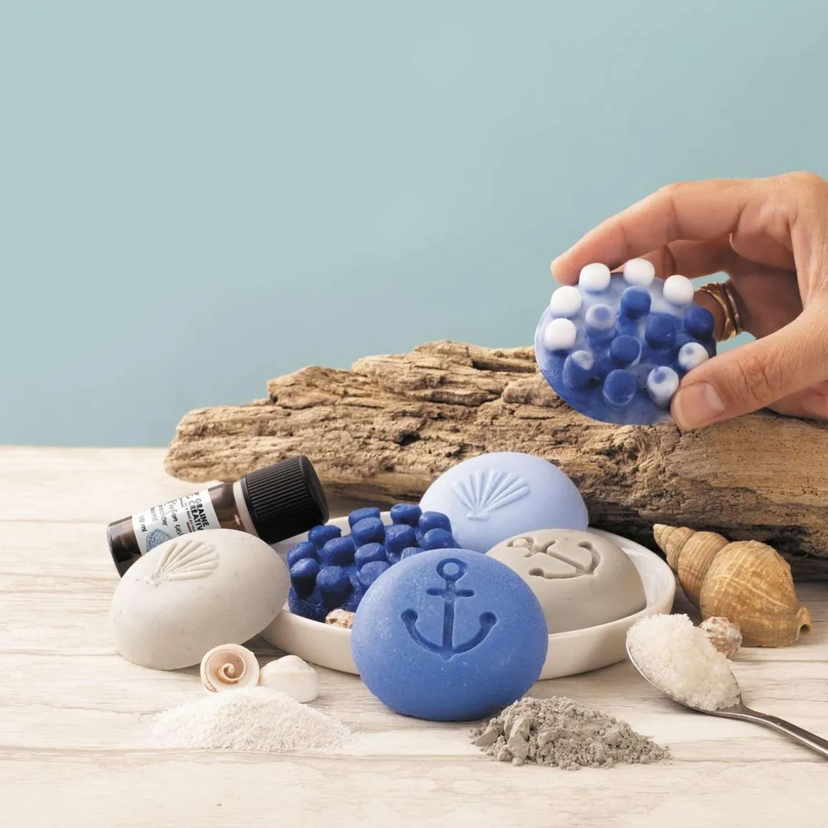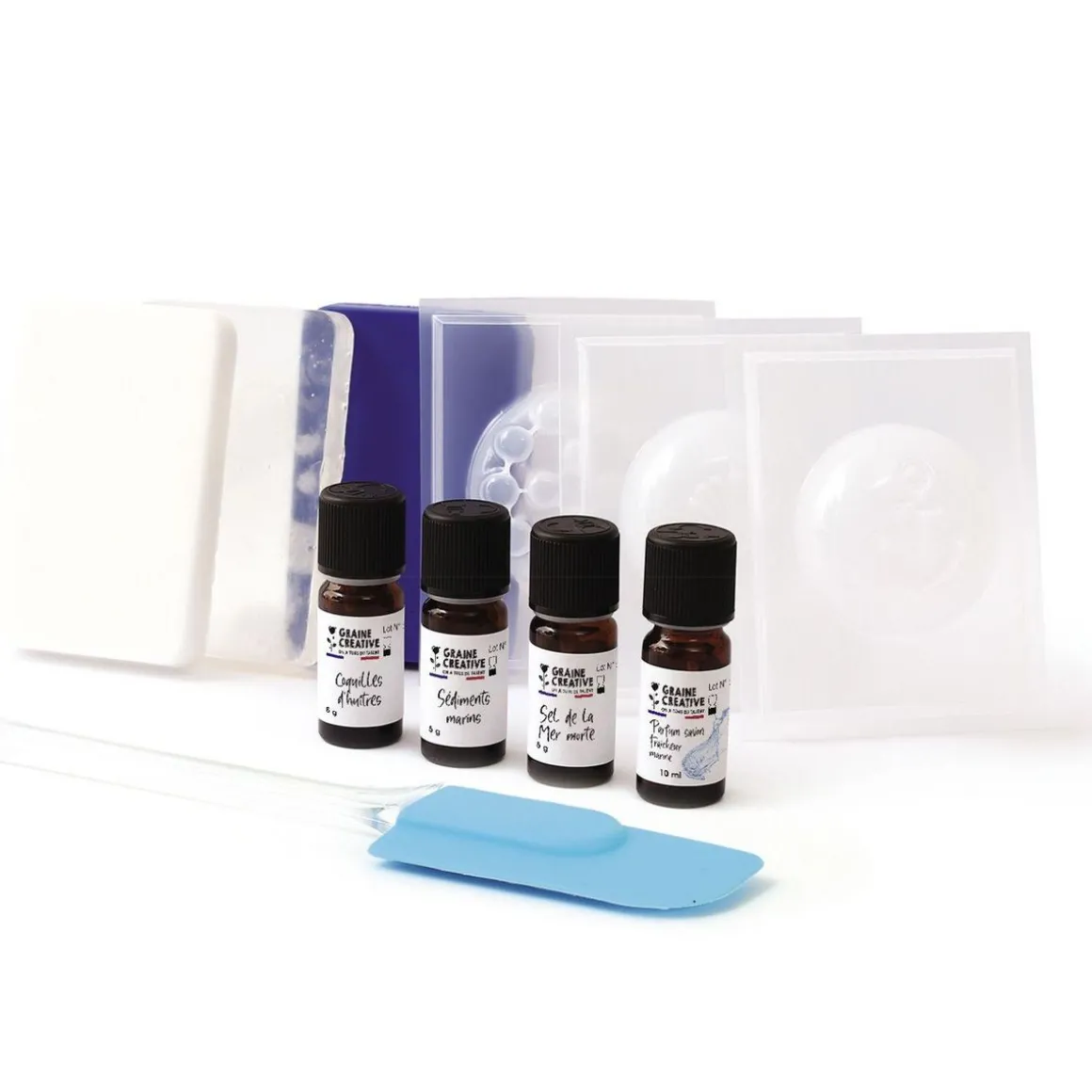 Un coffret bien rempli pour se lancer dans la fabrication de 6 jolis savons marins DIY. Mixez les moules et les couleurs, puis ajoutez les poudres naturelles selon vos envies : sel de la mer morte, poudre exfoliante de coquille d’huitre ou sédiments marins. Accessible aux débutants, ce coffret contient une notice détaillée pour vous guider. Contenu : 300 g de savon (blanc et bleu), 3 moules (motif ancre, coquillage et spécial gommage), 5 g de sel de la mer morte, 5 g de poudre de coquille d’huîtres exfoliante, 5 g de sédiments marins, 1 spatule, 1 parfum 10 ml, 1 notice illustrée.