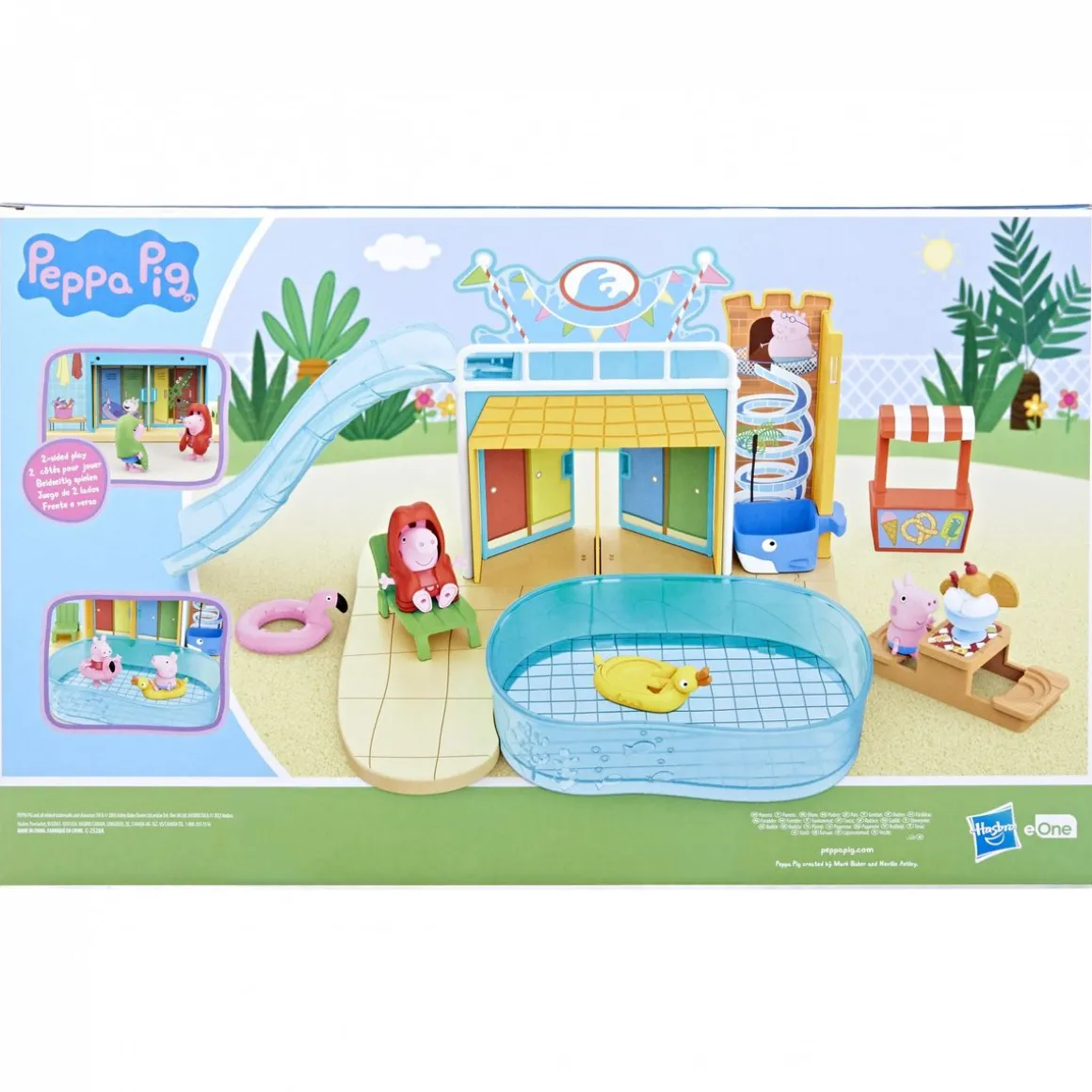 Peppa Pig adore aller s’amuser au Parc Aquatique avec son petit frere Georges ! Le coffret contient un playset avec un décor recto-verso pour entrer ou sortir des vestiaires, une piscine, un ascenseur en forme de petite baleine pour accéder au grand toboggan, les 2 figurines de Peppa et Georges et de nombreux accessoires (serviettes-ponchos amovibles, bouée flamand-rose, bouée canard jaune, chaise longue, table de pi