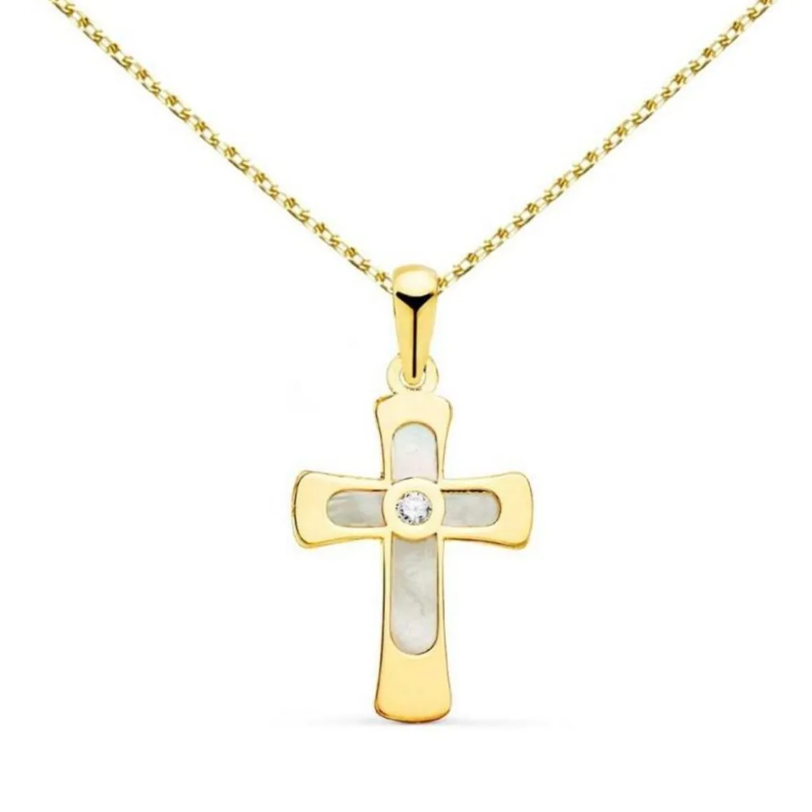Découvrez ce magnifique pendentif en forme de croix, réalisé en or jaune 18 carats 750/000. Ce bijou unique est sublimé par de la nacre délicate et un oxyde de zirconium étincelant, offrant une combinaison parfaite de tradition et d’élégance.