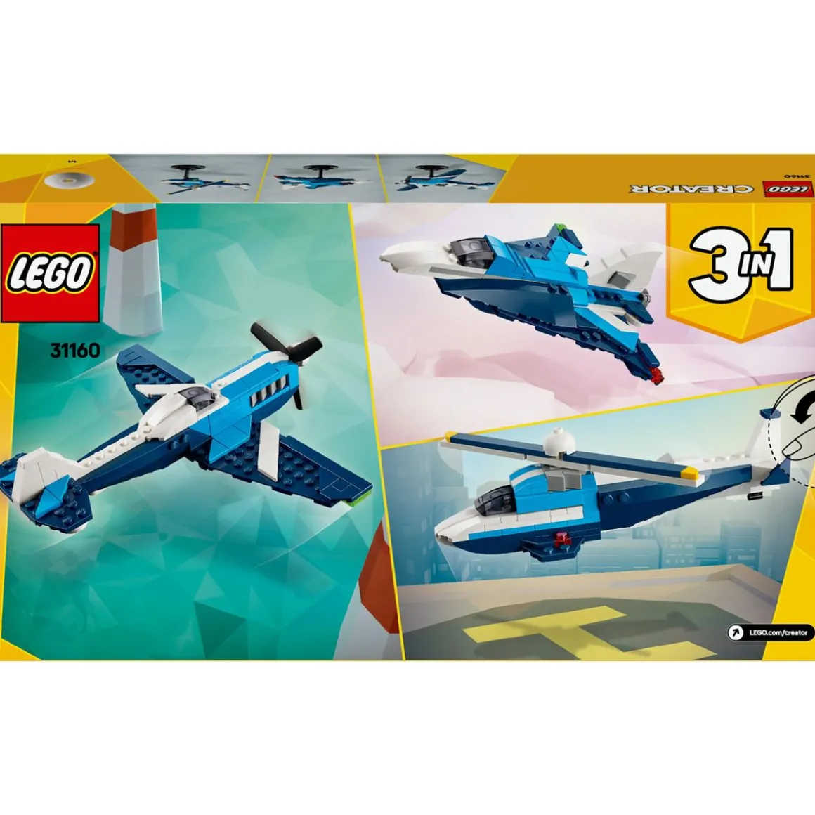 Les enfants peuvent choisir de créer l’un des 3 incroyables engins de ce set : un avion doté d’une hélice qui tourne et de roues mobiles, un avion à réaction ultra-rapide ou un hélicoptère avec une pale rotative. Chaque modèle peut être exposé sur un support en briques, et le set constitue un formidable cadeau à offrir à des enfants imaginatifs.