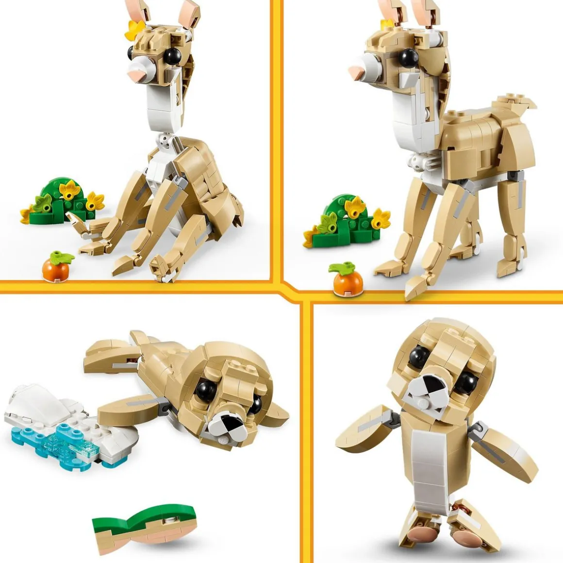 Les filles et les garçons peuvent construire 3 animaux LEGO articulés avec les mêmes briques : un adorable lapin avec un tournesol et une carotte, un lama avec un pré verdoyant et une demi-carotte et un phoque avec une plaque de glace et un poisson. Les 3 scènes sont parfaites pour inspirer les enfants et décorer une chambre.