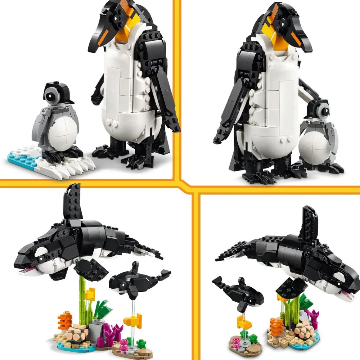 Les enfants peuvent construire 3 familles d’animaux LEGO® articulés avec les mêmes briques : un panda avec son bébé à côté de pousses de bambou, une orque et son petit pouvant être exposés ensemble sur des supports transparents ou un manchot et son poussin sur une plaque de glace et d’eau. Les 3 scènes sont parfaites pour s’amuser et décorer une chambre.