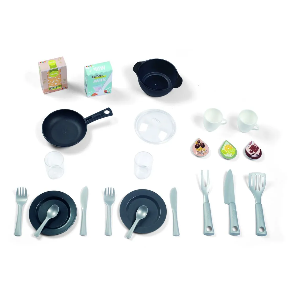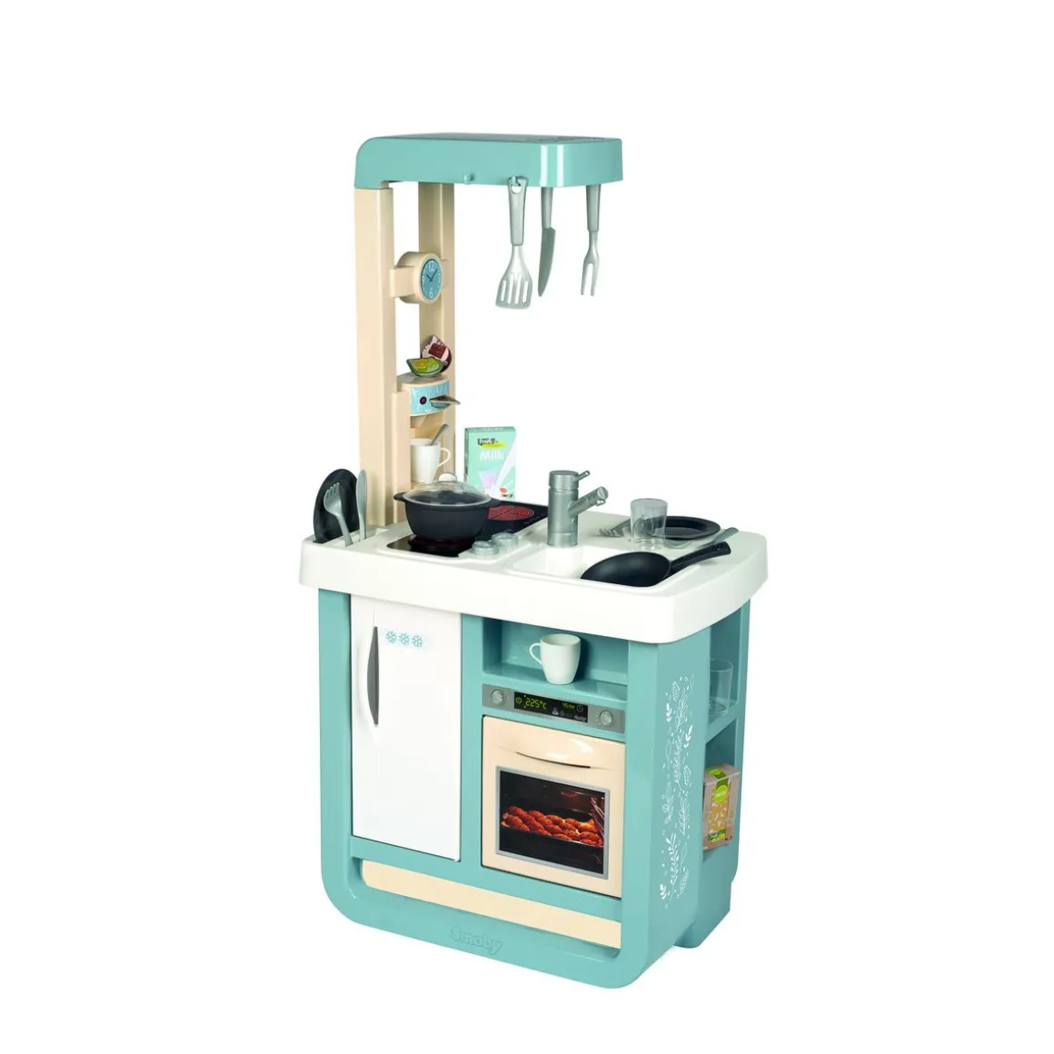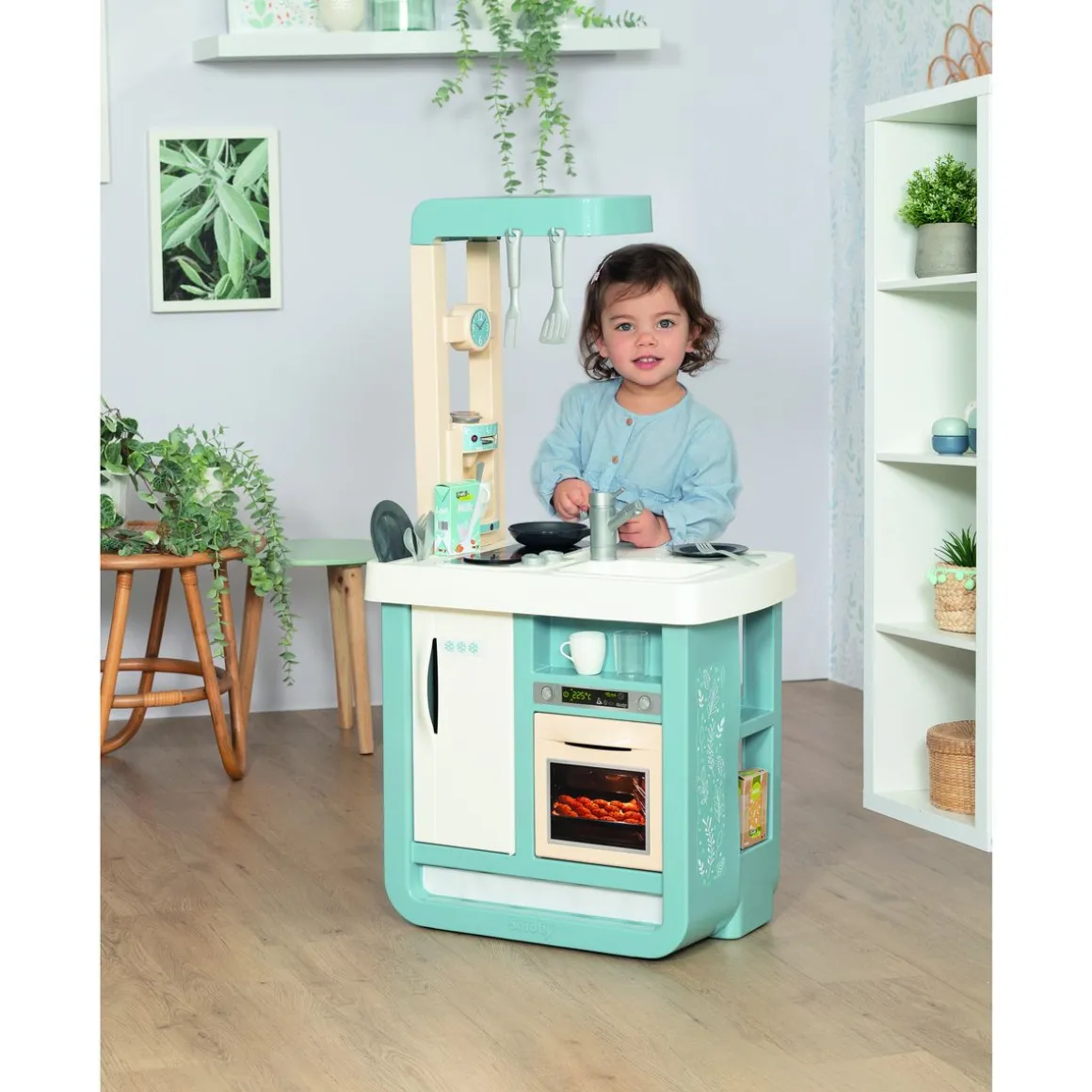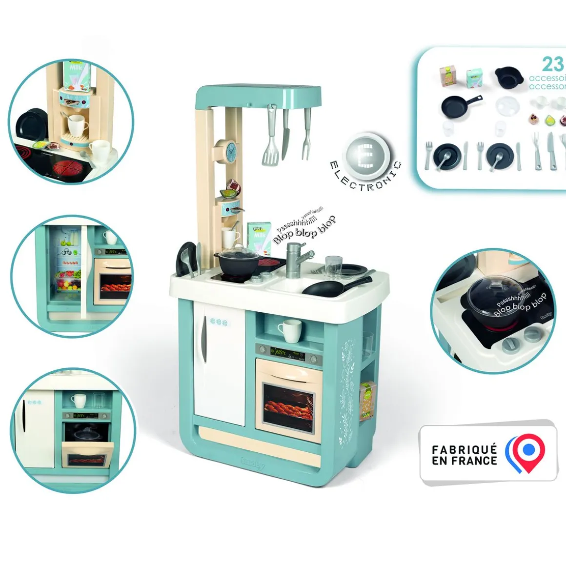 Avec son design moderne et ses couleurs douces, la cuisine jouet s’integrera dans tous les interieurs. Elle a une hauteur de 96 cm. Tres stable et solide, le jeu de cuisine fera leur bonheur, leur promettant des heures de plaisir ! La cuisine est composee de : 1 plaque de cuisson avec effets sonores, 1 evier, 1 four, 1 refrigerateur, 1 hotte, 1 machine a expresso avec capsules, et divers espaces de rangement.