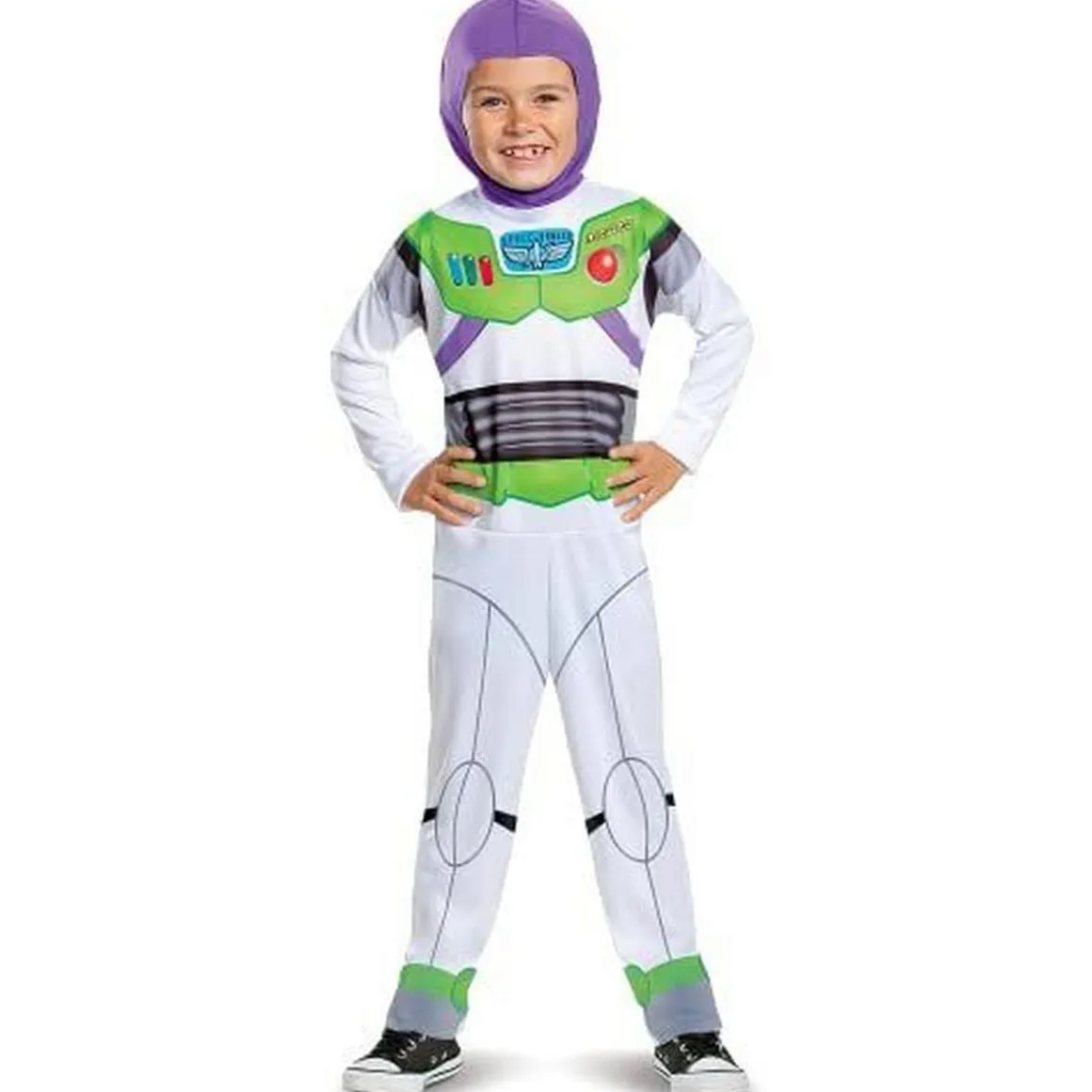 Tel un ranger de l’espace, enfile ton costume Buzz l’Eclair et pars à l’aventure ! Combinaison blanche imprimée sur le haut, cagoule détachable mauve.