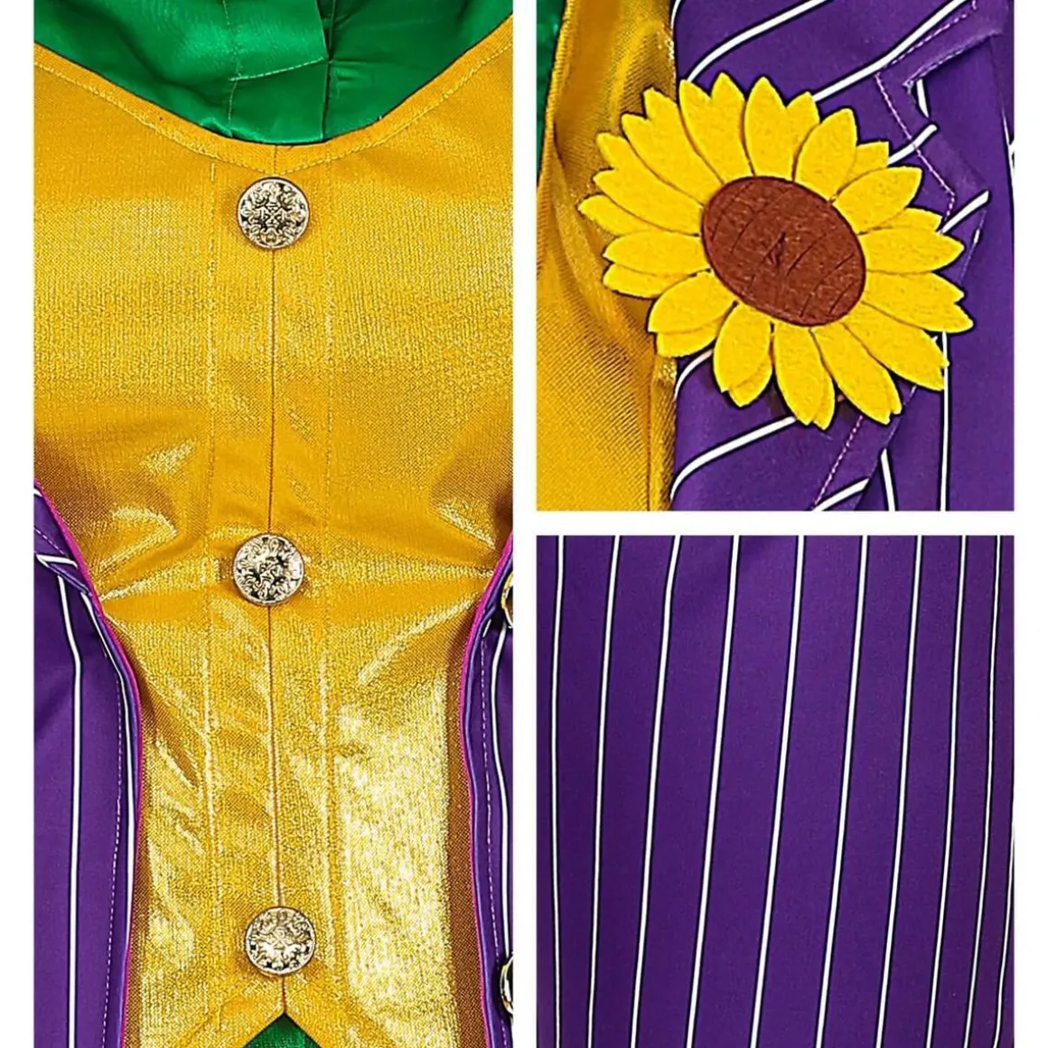 M – 38/40 – Contenu : 1 veste avec chemise et gilet, 1 pantalon, 1 paire de gants.Ce déguisement se compose d’un haut avec chemise, gilet et veste intégrée. La chemise est vert satiné. Le gilet est jaune avec 3 boutons ronds au milieu. Le col rond du gilet laisse apparaitre la chemise. La veste par-dessus est ouverte. Elle est violette avec de fines rayures blanches. Elle possède deux boutons ronds. Une fleur de tournesol est attachée sur le devant à gauche de la veste. Le pantalon est de la même couleur que la veste. Une paire de gants est également incluse. Elle est violette satiné. Age minimum : la naissance