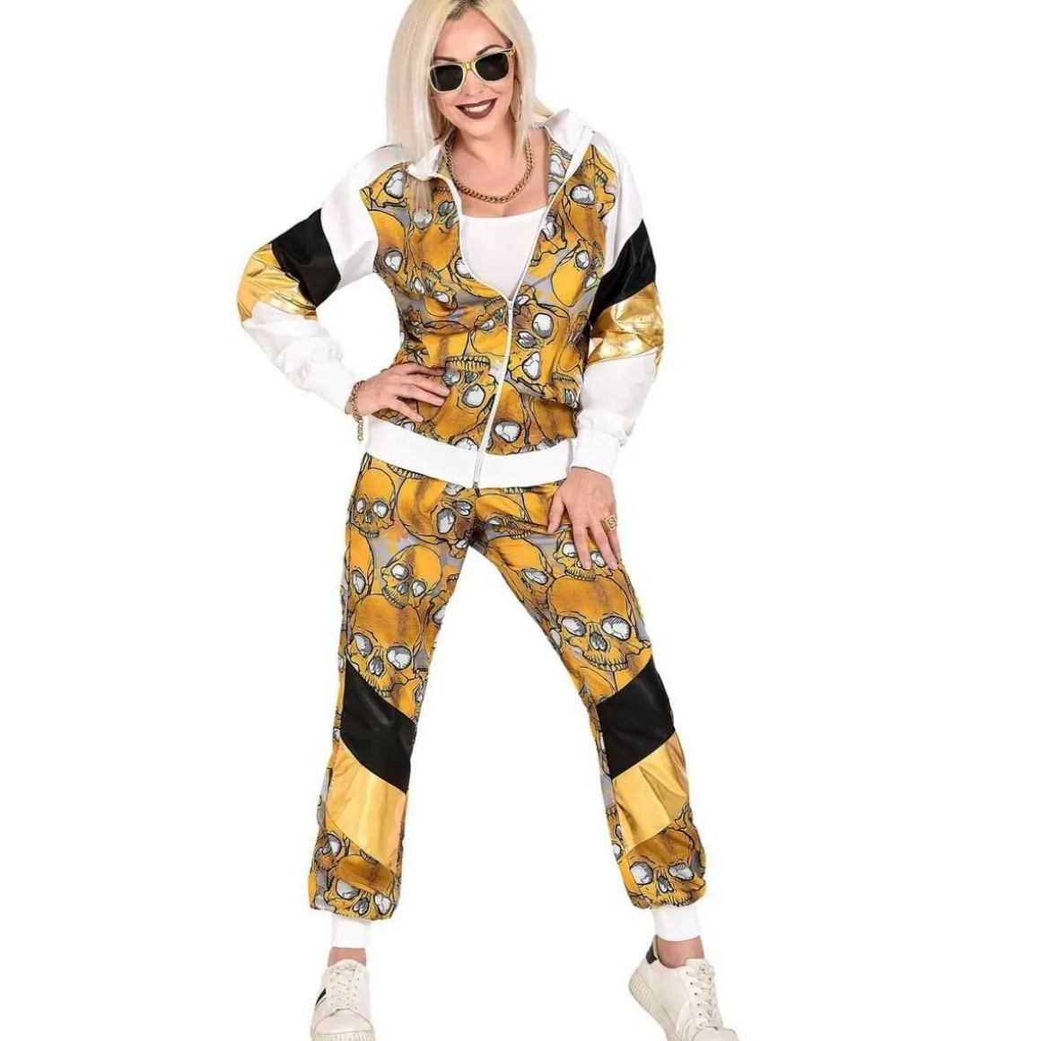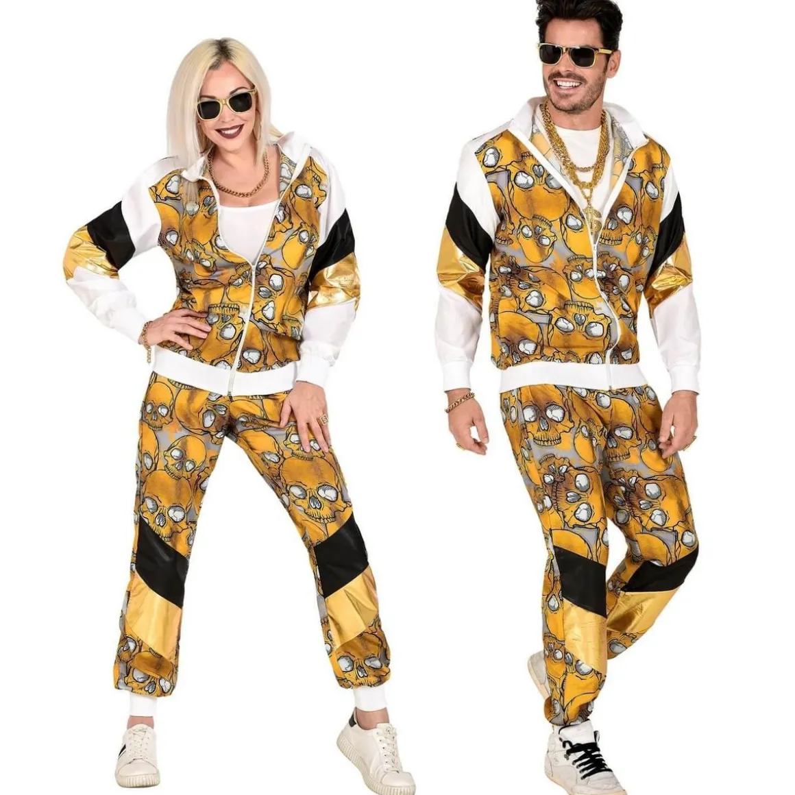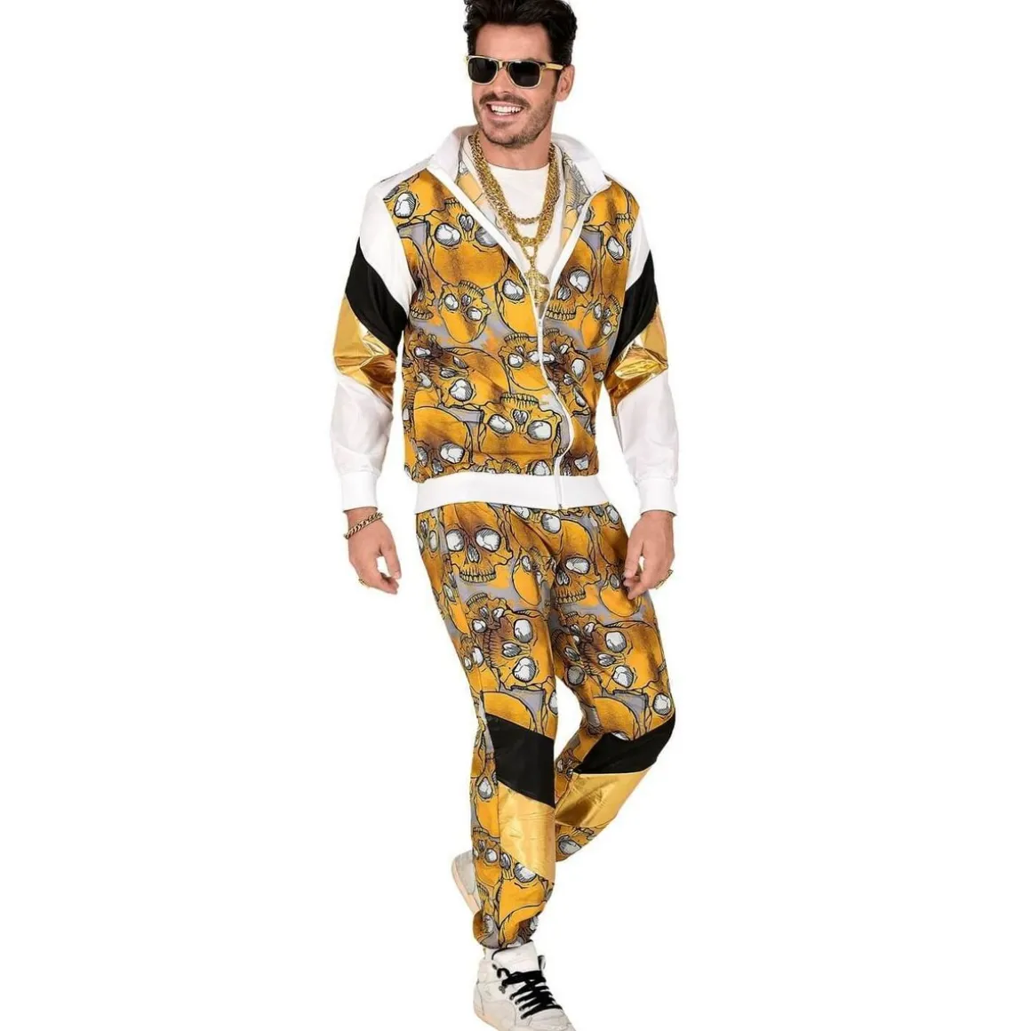 M – Contenu : 1 veste, 1 pantalon. Ce déguisement se compose d’une veste et d’un pantalon assorti. Le pantalon est resserré au niveau des chevilles. Il possède une bande noir et une bande doré sur chaque jambe. Il y a un motif avec des cranes de squelette dorés. La veste possède les mêmes motifs que le pantalon. Les manches sont blanches et resserrées au niveau des poignets. La veste peut se fermer à l’aide d’une fermeture éclair. Age minimum : la naissance