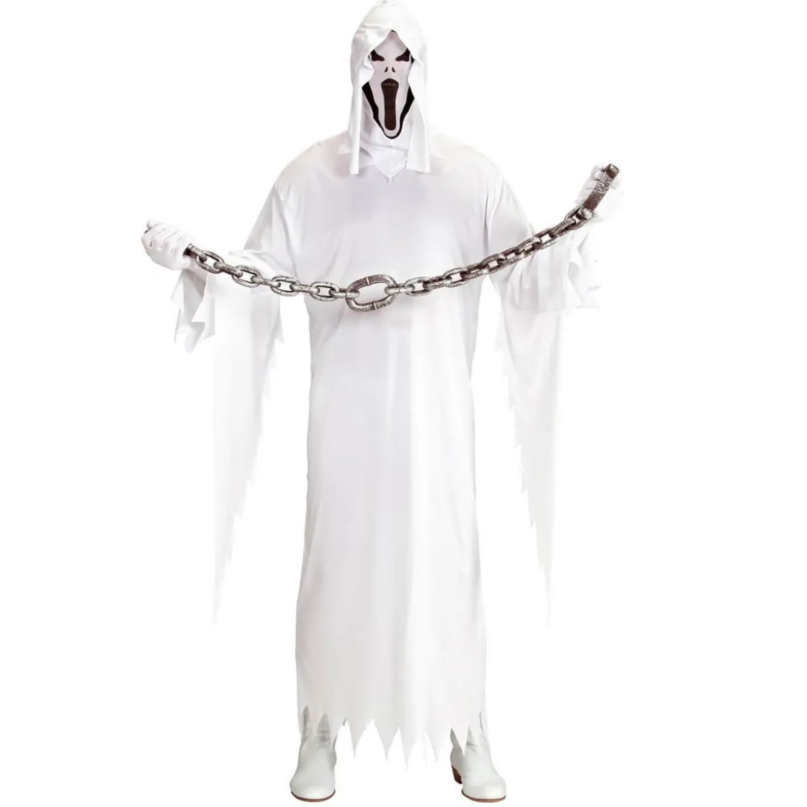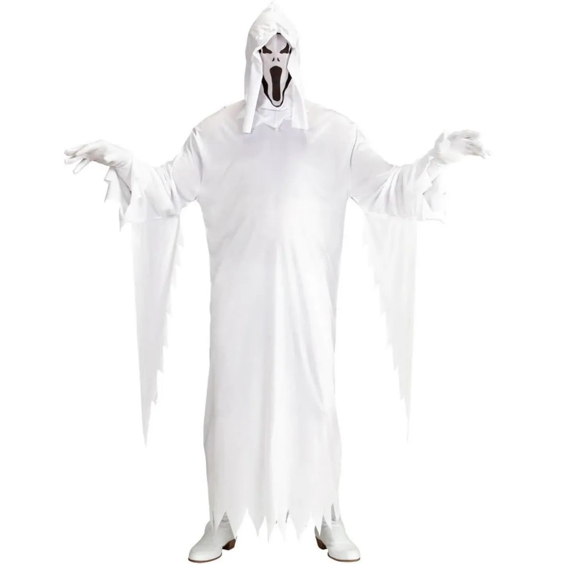 M – Contenu : 1 tunique, 1 masque avec capuche.Ce déguisement se compose d’une longue tunique blanche à manches longues. Il y a des effets de déchirures sur le bas de la tunique et le bas des manches. Le déguisement vient avec un masque avec capuche qui s’enfile comme une cagoule. Le masque est noir avec un visage de fantôme blanc ouvrant la bouche comme s’il hurlait. Age minimum : la naissance