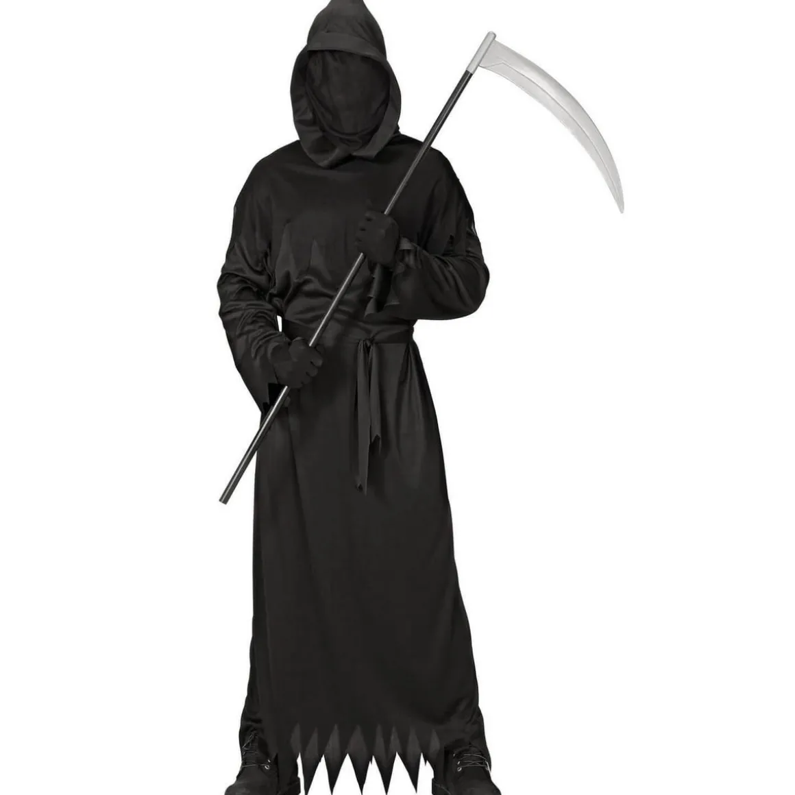 XXL – Contenu : 1 tunique avec capuche et masque, 1 ceinture.Ce déguisement comprend une tunique entièrement noire. Elle possède des manches longues. Le bas des manches et de la tunique sont découpés en pointe pour faire un effet déchiré. La tunique peut être resserrée à la taille avec une ceinture en tissu noir incluse. Le déguisement vient avec une capuche et un masque intégré. Le masque est en tissu noir et recouvre intégralement le visage. Age minimum : la naissance