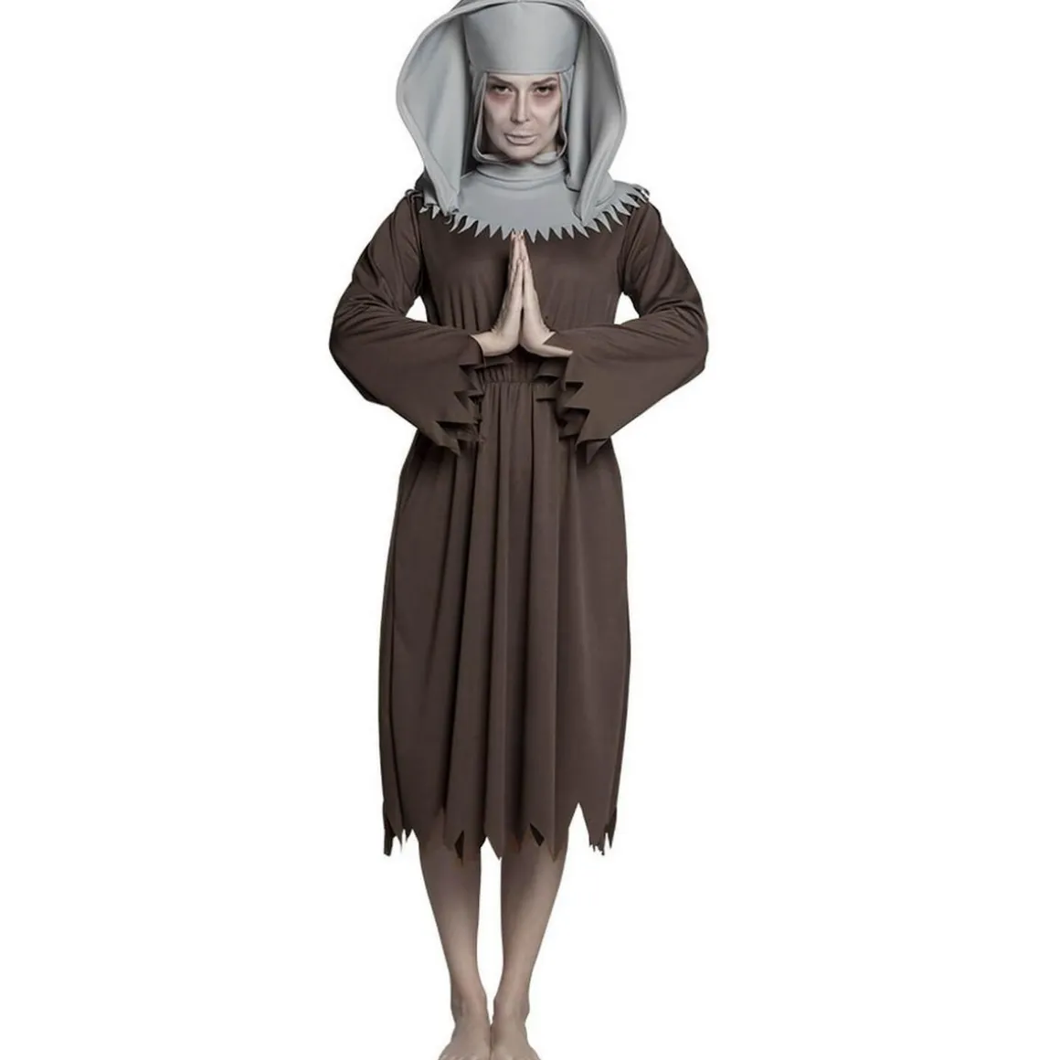M – 38/40 – Contenu : 1 robe, 1 coiffe.Ce déguisement se compose d’une robe à manches longues marron. Elle possède des détails au niveau des manches et du bas de la robe pour un effet déchiré. Elle est resserrée au niveau de la taille par un élastique. Le col est en tissu gris style collerette. Une coiffe est incluse avec le déguisement. Elle reprend le modèle des traditionnelles coiffes de nonne mais en tissu gris pour l’esprit fantomatique. Age minimum : la naissance
