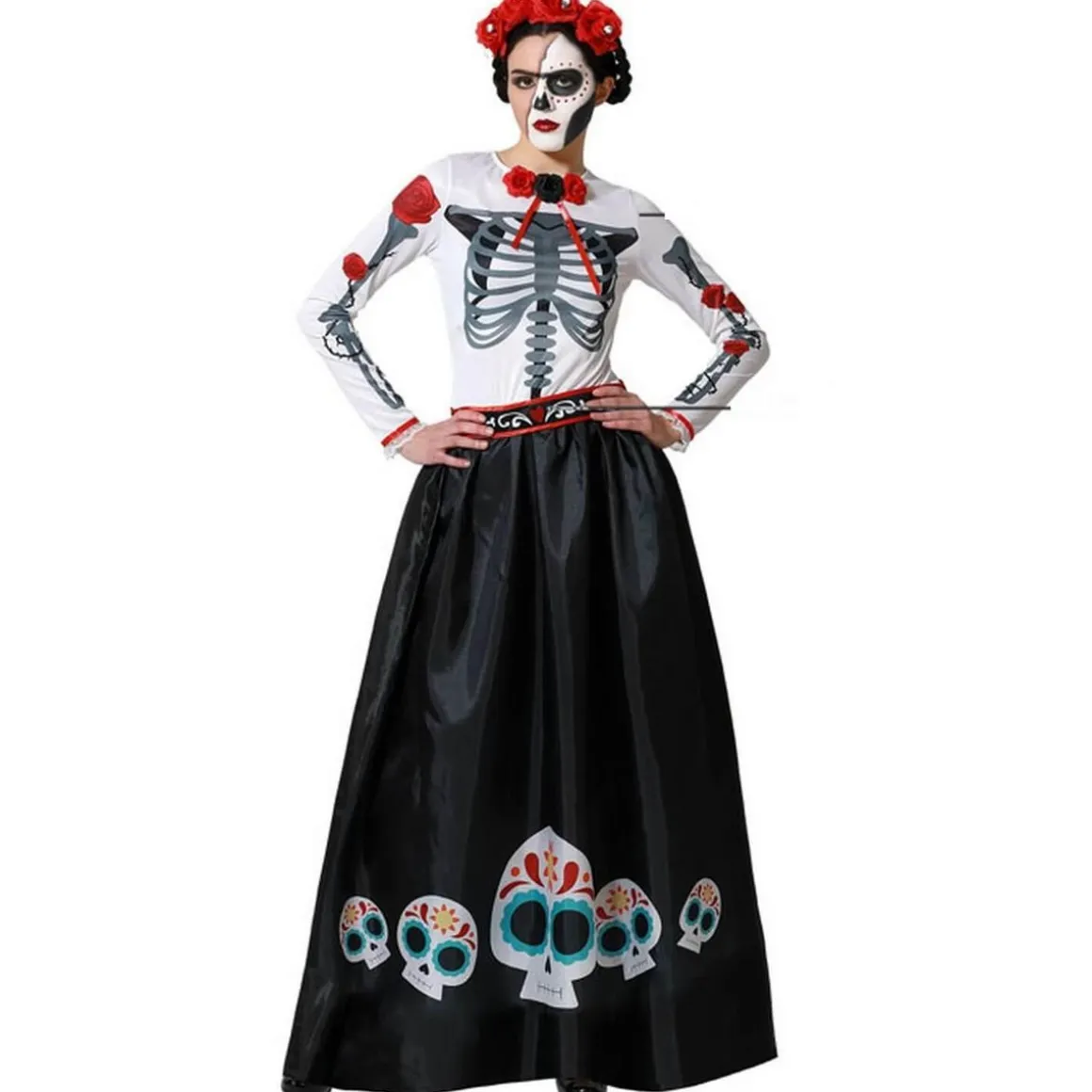 XXL – Contenu : 1 robe et 1 ceinture. Ce déguisement se compose d’une ceinture et d’une robe avec des têtes de morts. La robe est à manches longues. Le bustier est blanc avec un imprimé noir qui représente les os d’un squelette. Il y a également des fleurs rouges et noires.Vous retrouverez des détails de dentelle blanche avec un liseret rouge sur les poignets. Le jupon est noir avec des dessins de calaveras (têtes de morts mexicaines) colorées. La ceinture est noire et joliement décorée avec des détails rouges pour être assortie avec le costume. Age minimum : la naissance