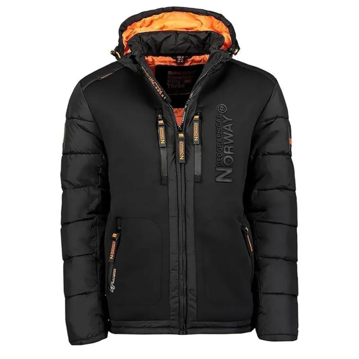 Craquez la doudoune de la marque GEOGRAPHICAL NORWAY Coloris : noir, orange Capuche fixe Poches zippées sur les côtés Manches longues Logo en caoutchouc Composition : 100 % Polyester