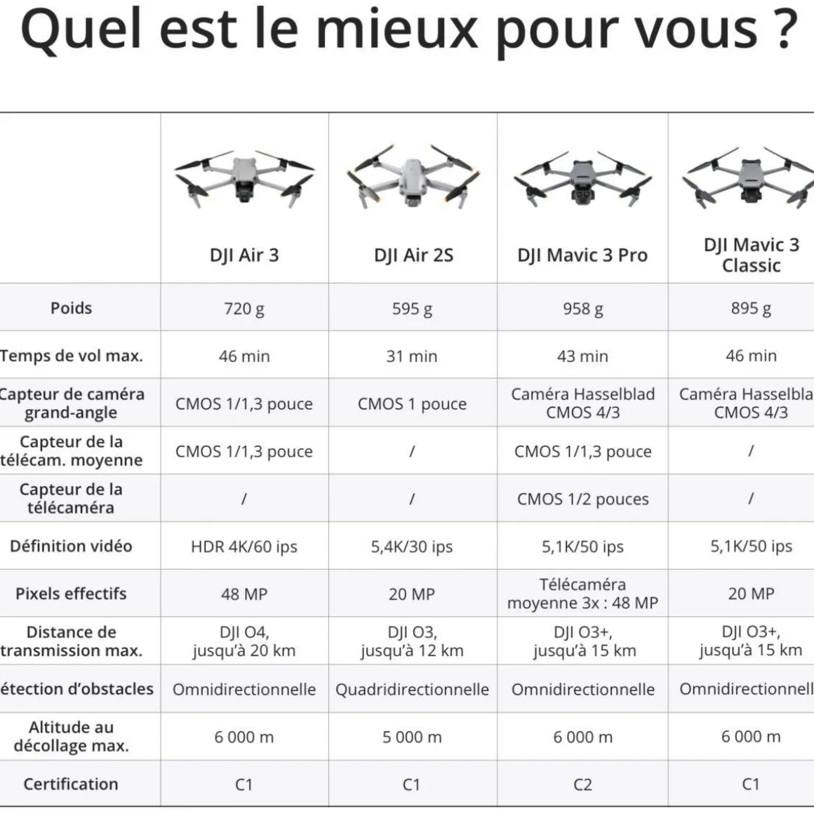 | Livré avec | DJI Air 3 X3 Hélices (paire) à faible bruit DJI Air 3 Protection de nacelle DJI Air 3 Radiocommande DJI RC-N2 Câble radiocommande DJI RC-N2 (connecteur USB-C) Câble DJI RC-N2 (connecteur Lightning) Câble USB-C X1 Batterie de Vol Intelligente D | |