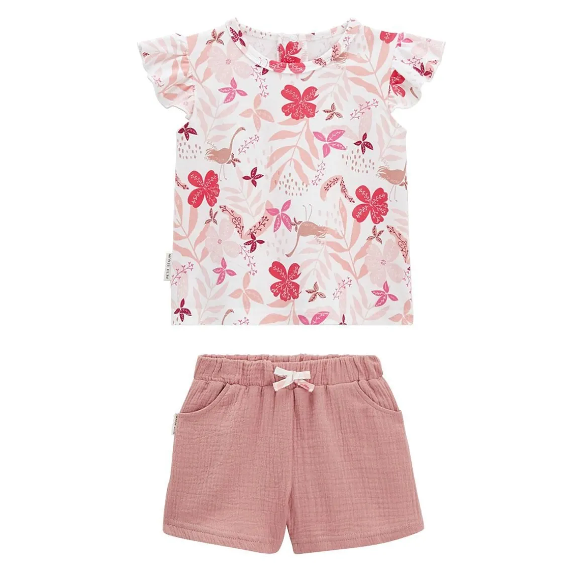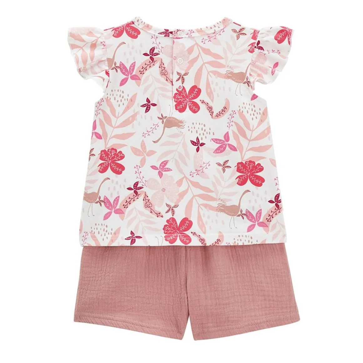 Optez ce bel ensemble couleur vieux rose : un t-shirt et un short pour se balader tout l’été ! On adore cette ambiance florale sur le t-shirt et la douce matière du short en coton gaufré. Produit labellisé STANDARD 100 by OEKO-TEX ® (BJ020 189402 TESTEX) Le short tout doux en coton gaufré ! Le joli t-shirt à volants