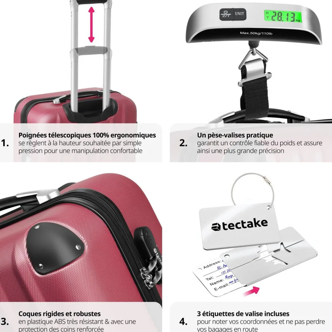 Que ce soit pour de courts voyages d’affaires ou de longues vacances – le set de valises 3 pièces Talia de tectake répond à toutes vos exigences en matière de qualité et de design.
