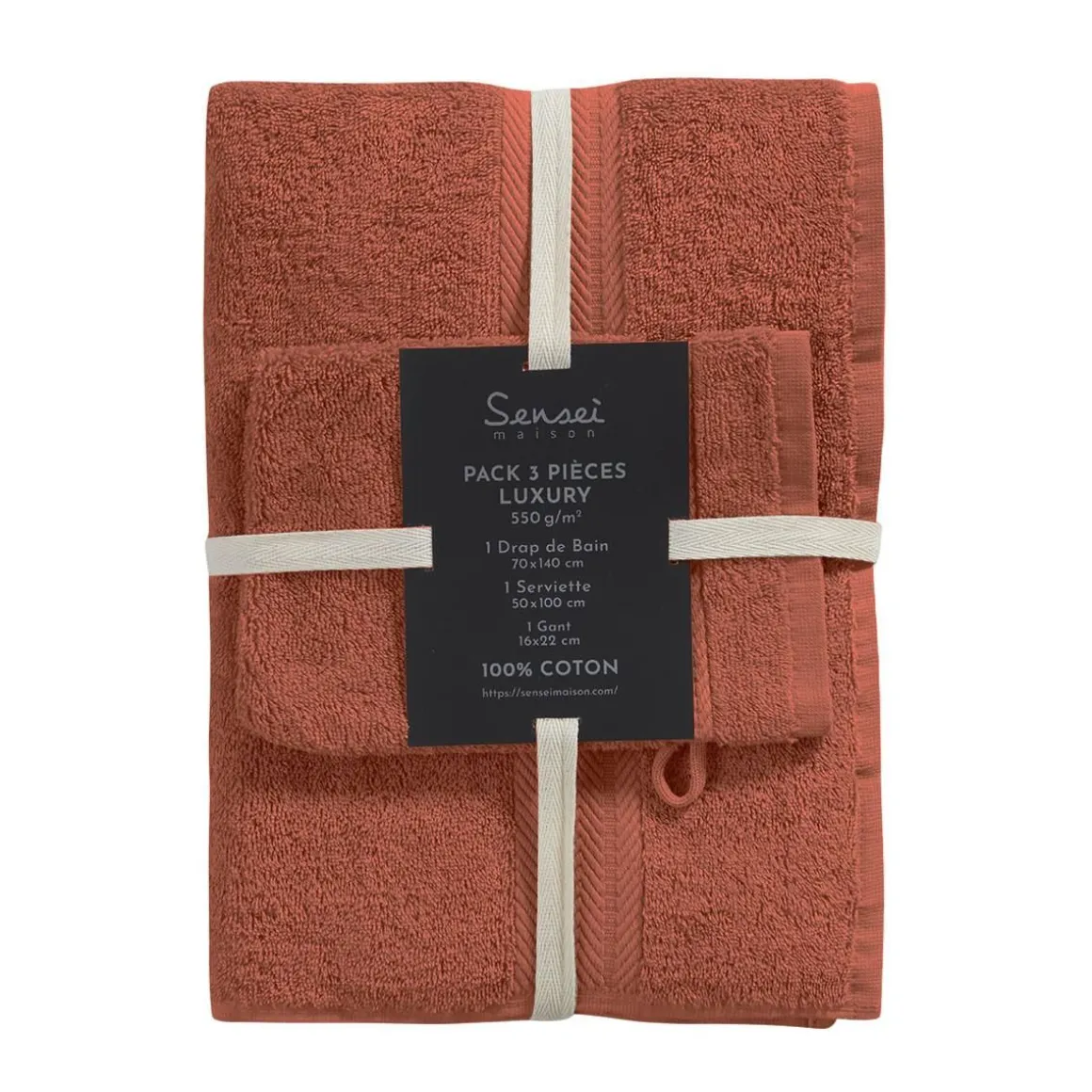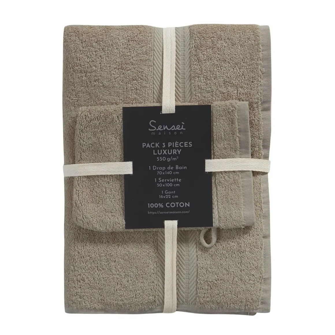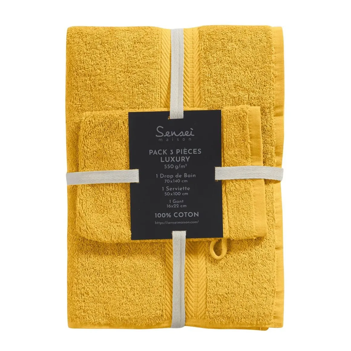Retrouvez le pack essentiel de Sensei Maison dans notre lot de 3 pièces d’éponge de bain LUXURY ! Le pack contient 1 gant de toilette, 1 serviette de toilette 50x100cm et 1 serviette de bain 70x140cm, le tout 100% coton pour une absorption efficace de 550gr/m². Vous pourrez compléter ce pack par d’autres articles de la gamme LUXURY de chez Sensei Maison (serviettes d’invités, tapis de salle de bain, peignoirs …).