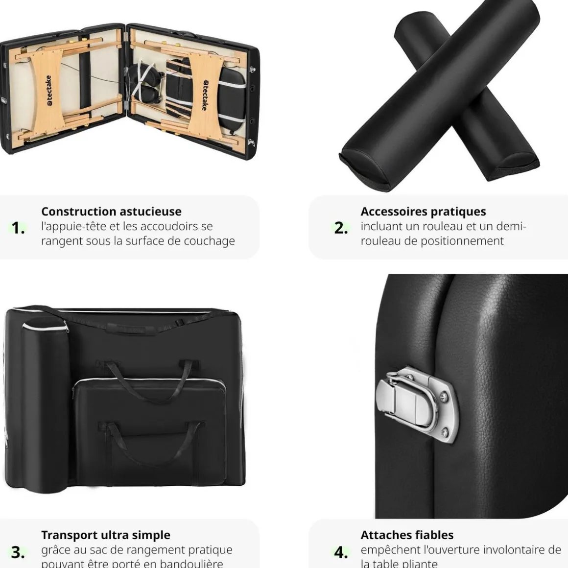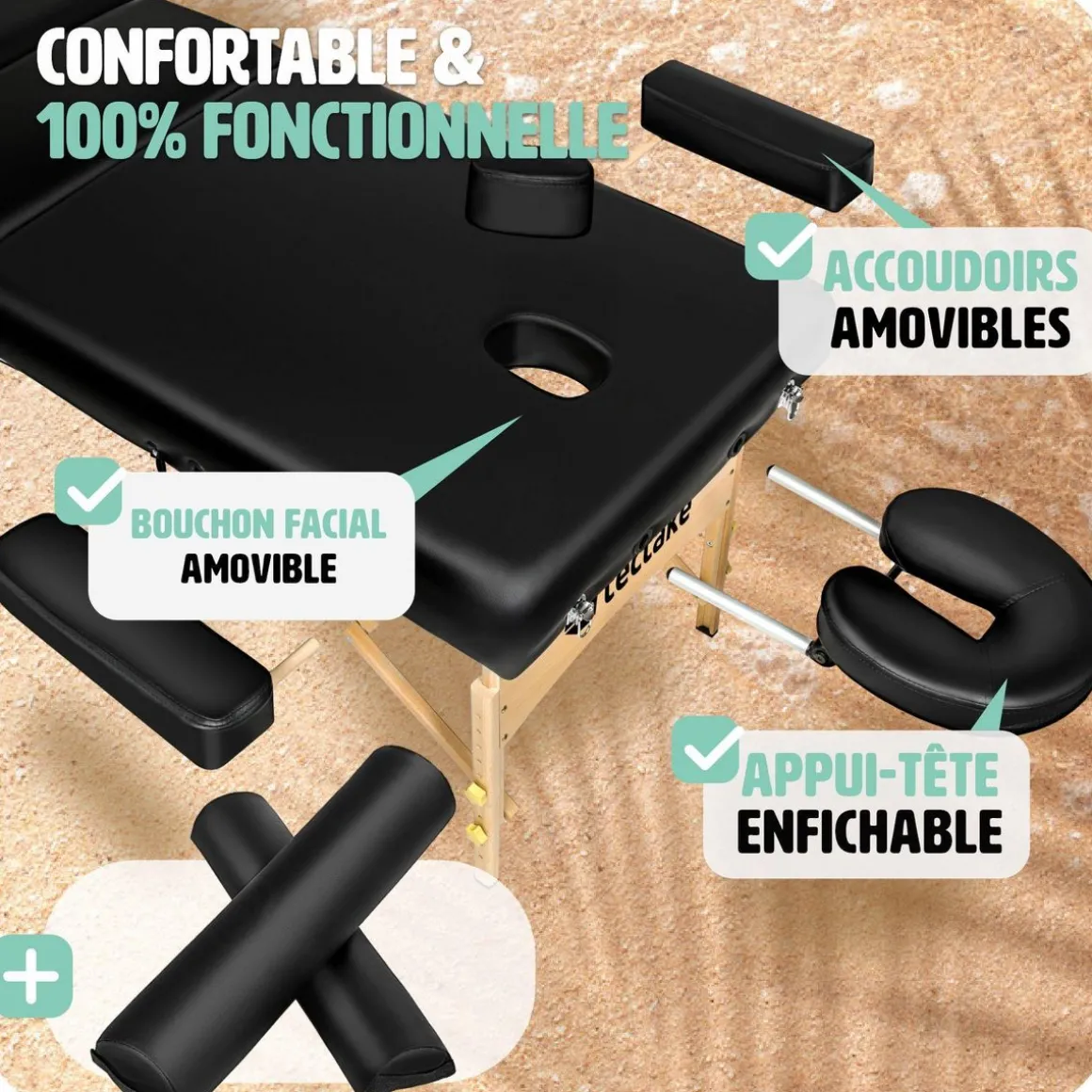 - Coussin facial amovible et supports amovibles pour la tête et les bras