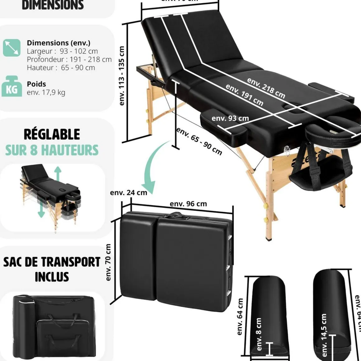 - Longueur de la table sans appui-tête : env. 191 cm