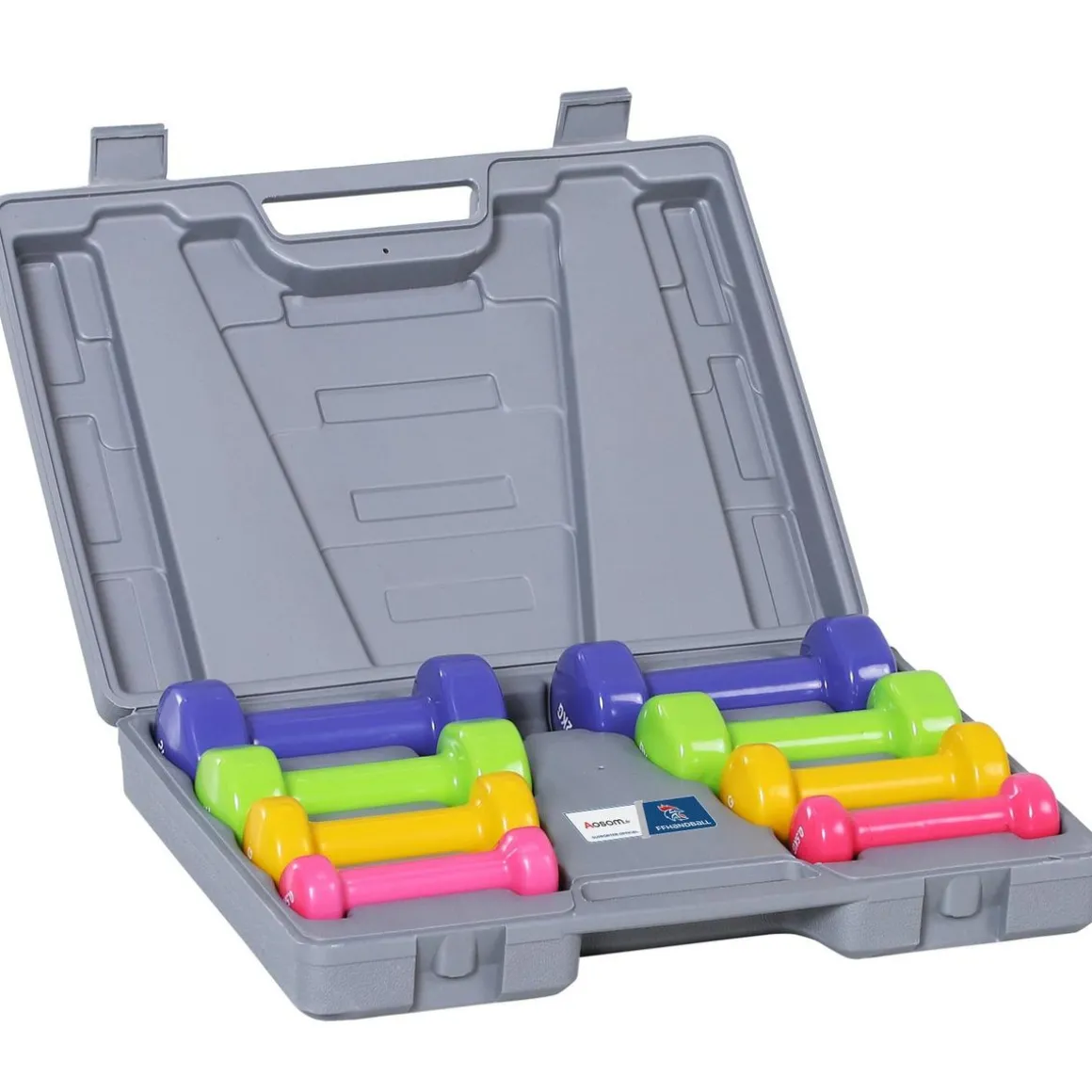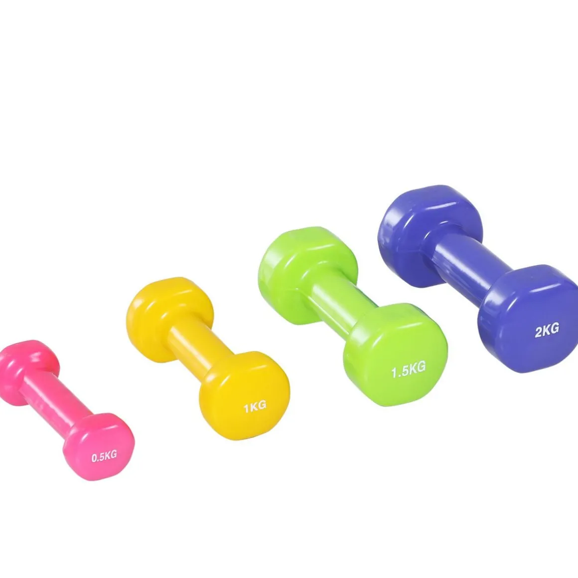 – Ensemble de 8 pièces composé de 2 haltères de 0,5 Kg, 2 haltères de 1 Kg, 2 haltères de 1,5 Kg, 2 haltères de 2 Kg