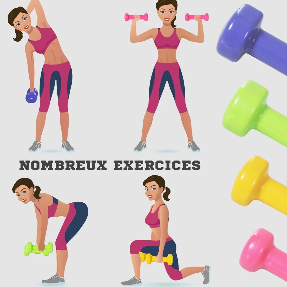 – Idéal pour le squat, développé assis, développé couché, fente avant, curl, élevations, kick back, etc…
