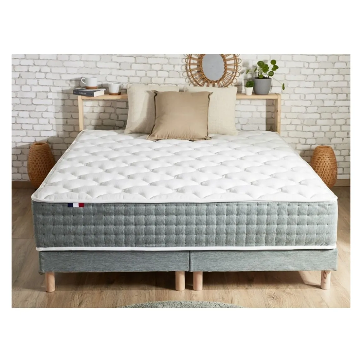 Pour faire le bon choix, jetez votre dévolu sur ce superbe ensemble HYGGE de taille 160x200cm. Matelas épais de 26cm, équipé de 792 ressorts ensachés et muni de 7 zones de confort différenciés enrobés de mousse ferme d’une densité de 25kg/m3, il a été pensé pour parvenir à une indépendance de couchage et un confort parfait, afin que ses futurs propriétaires puissent profiter de belle et longue nuit, d’un sommeil réparateur et non gêné. Élaboré avec un soutien ferme et un accueil moelleux, il dispose de 7 zones de soutien différenciées, pour bénéficier d’une agréable sensation de confort tout en gardant une posture et un maintien approprié tout au long de la nuit. Il est également doté de 2 faces adaptées et conçus spécialement pour l’hiver et l’été. Côté finition, il en fera rougir plus d’un avec ses plates-bandes capitonnées vert céladon, ses poignées de manutention et son aérateur, sans oublier son coutil stretch 100% polyester. Galonné 2 faces, fabrication 100% française.