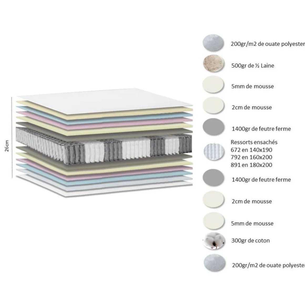 Face Hiver : 500g/m² de Pure Laine + 400 g/m² de ouate hypoallergénique + Mousse de contact / Face Eté : 300g/m² deCoton + 400 g/m² de ouate hypoallergénique + Mousse de contact .