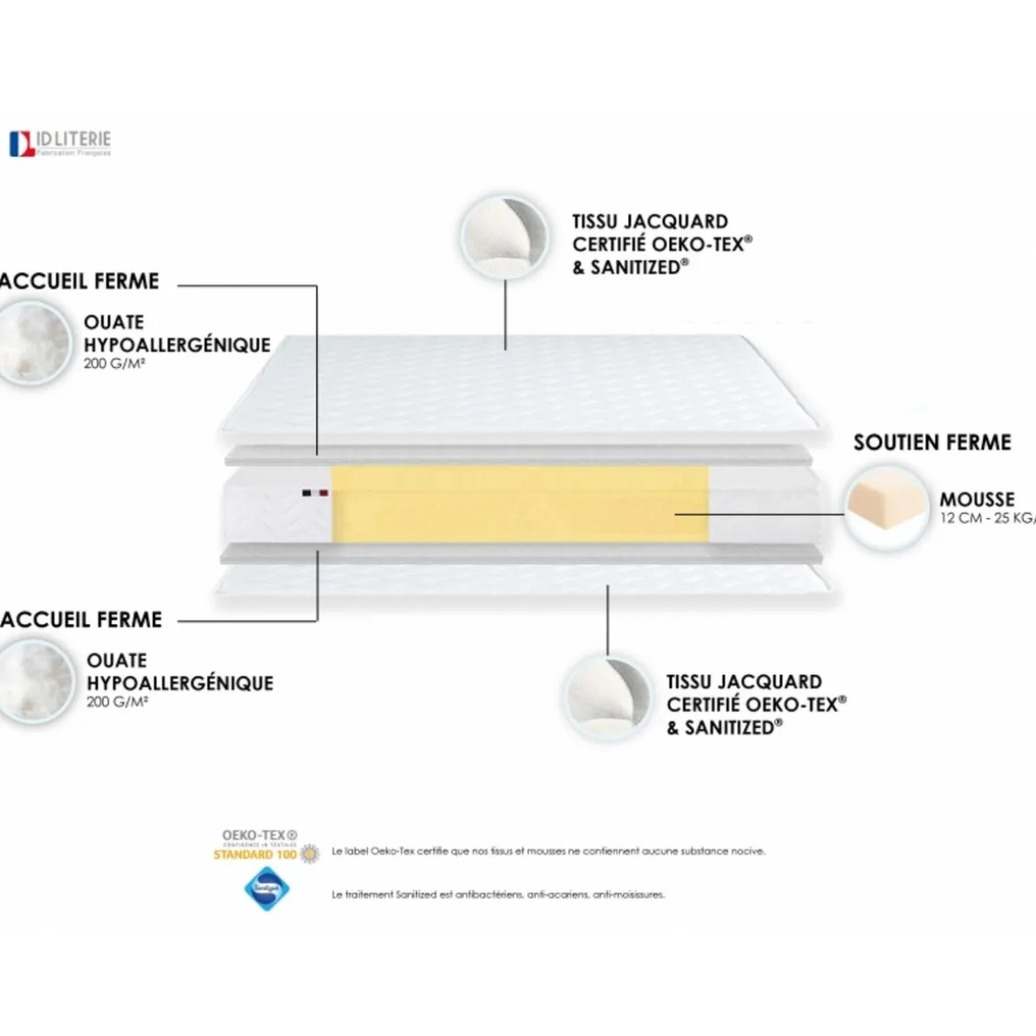 Point fort 4 : Fabrication Française – Certfié ISO 9001 – Usine eco-responsable : 98% des déchets recyclés – Tissus & mousse Certifiés OEKOTEX 100 -Bois sommier certifié PEFC – Garantie : Matelas 5 ans