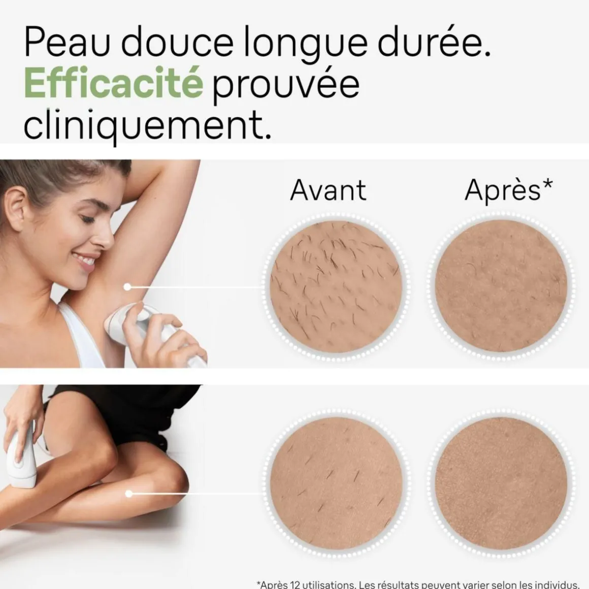 | Epilation | Lumière pulsée : Génère une chaleur précise dans le derme pour déclencher le ralentissement de la repousse du poil. | |