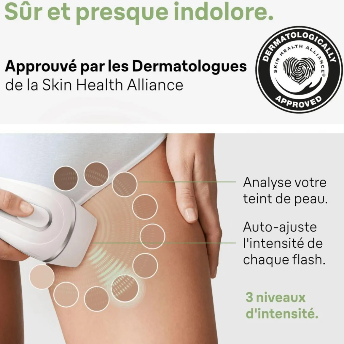 | Type d’épilateur | lumière pulsée, elle permet une épilation semi-définitive des poils en endormant les follicules pileux. La lumière émise est absorbée par la mélanine des poils, en contraste avec la peau, afin d’arrêter le cycle de croissance | |