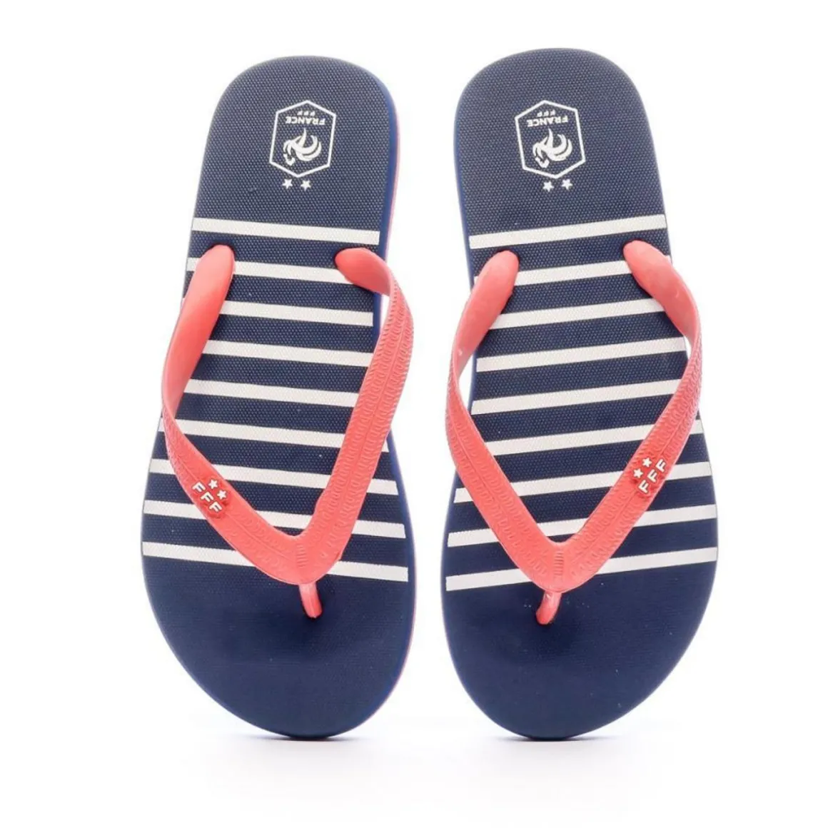 Tongs de l’équipe de France disponibles à petit prix ! Couleurs : Marine, Rouge, Blanc Bride synthétique Ecusson FFF Motif marinière Semelle extérieure texturée