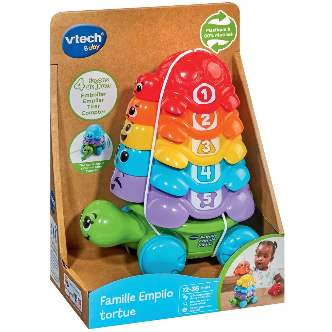 Famille empilo tortue (plastique réutilisé) – 12 – 36 mois. Des tortues à empiler ou à imbriquer sur le dos de leur maman pour développer la motricité fine de Bébé. 5 tortues de tailles et de couleurs différentes pour encourager les tout-petits à manipuler et découvrir. Sur chaque bébé tortue, on retrouve :. – Un visage exprimant une émotion pour découvrir les différentes humeurs. – Un chiffre pour apprendre à compter et résoudre une suite logique de 1 à 5. – Une couleur et un motif gravé pour stimuler la vue et le toucher de Bébé. 4 façons de jouer :. – Emboîter. – Empiler. – Tirer : une cordelette permet de transformer l’empilo en jouet à tirer et de faire rouler toute la famille tortue. – Compter. En roulant, Maman Tortue cahote et fait découvrir à votre tout-petit la notion d’équilibre en essayant de faire tenir les Bébés tortues sur son dos. Contient 80% de plastique post-industriel réutilisé. Boîte ouverte.