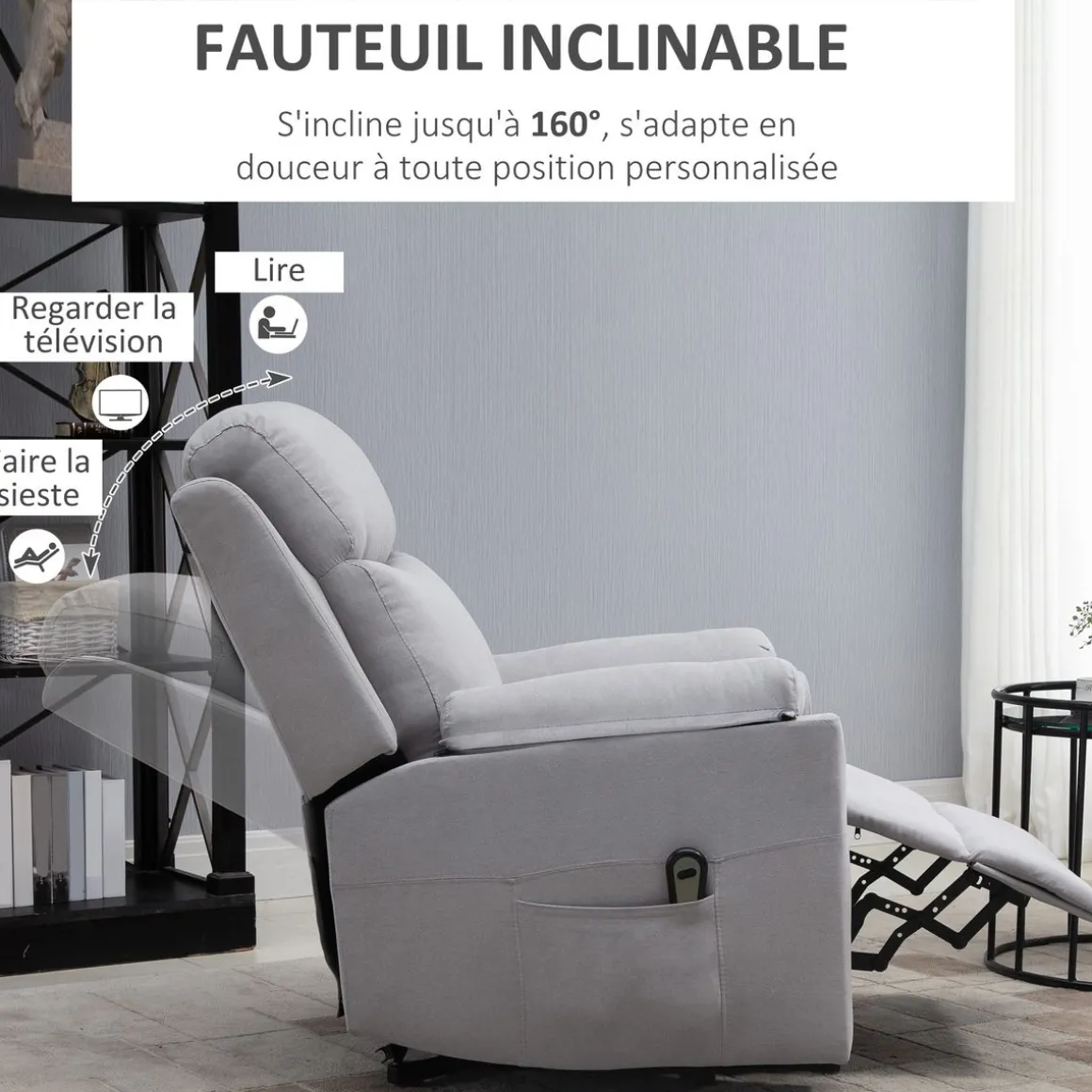 – Poche latérale de rangement pour votre télécommande, vos journaux ou autres