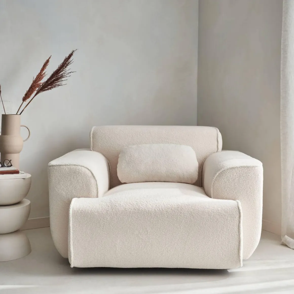 Ce fauteuil en bouclette blanche apporte une touche originale à une déco altique. Son apparence chic et élégante reste simple mais singulière. Avec une assise profonde, il est parfait pour se détendre le week-end ou après une longue journée de travail. Il est fourni avec un petit coussin rectangulaire déhoussable pour plus de confort et vous pouvez ajouter un plaid pour encore plus de style. Offrez-vous un salon minimaliste et cocooning grâce à son tissu tout doux et ses lignes raffinées !