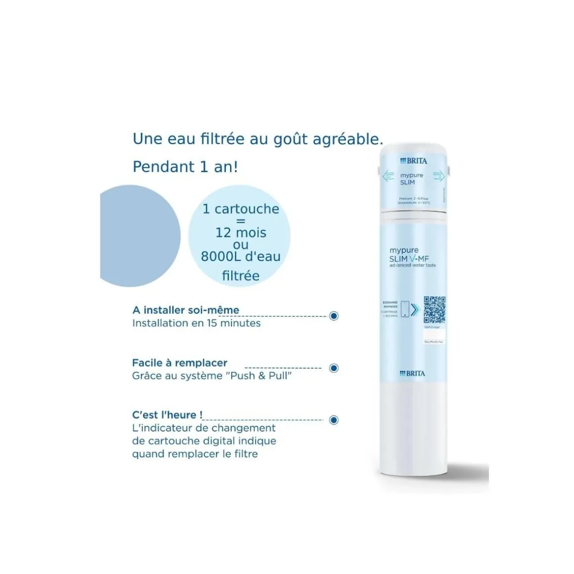 Le systeme de filtration de l’eau BRITA mypure SLIM V-MF vous permet d’obtenir instantanément de l’eau filtrée directement depuis votre robinet de cuisine existant. Il est facile a installer avec des outils standards, élimine 99,999 % des bactéries et des microparticules, et a une capacité de 12 mois (ou 8000 L) d’eau filtrée au goût agréable. Son indicateur de changement de cartouche vous permet de savoir quand il est temps de remplacer le filtre, et le changement de cartouche est simple grâce au systeme>.