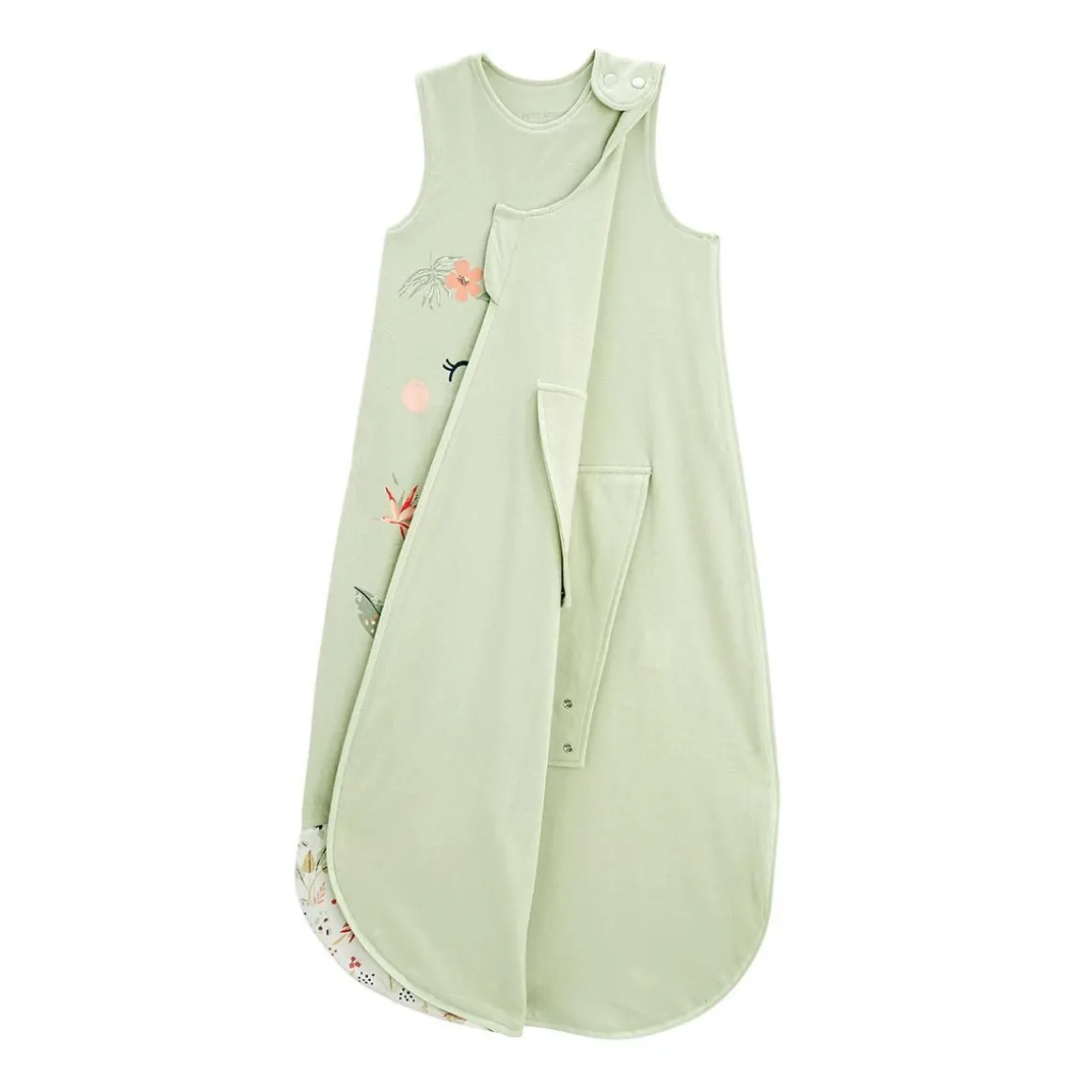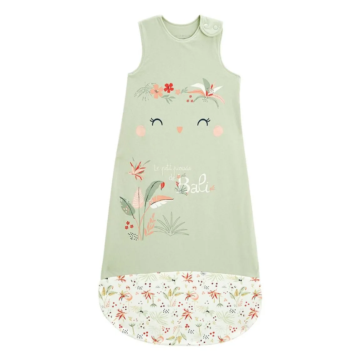 Un petit paradis pour entourer votre bébé tout au long de la nuit. Craquez pour son côté floral hyper tendance, sa jolie couleur vert amande et son petit visage trop mignon. Légère pour les beaux jours, cette gigoteuse sera parfaite pour les nuits de bébé. Produit labellisé STANDARD 100 by OEKO-TEX ® (BJ020 189402 TESTEX) Cale bébé ajustable à l’intérieur jusqu’au 6/18 mois inclus Ouverture zippée sur toute la longueur avec patte de protection Longueur adaptable grâce à un système de pression en bas de la gigoteuse Indice de chaleur : TOG 1 Pour plus d’informations, voir les avertissements et recommandations dans l’onglet détails et entretien
