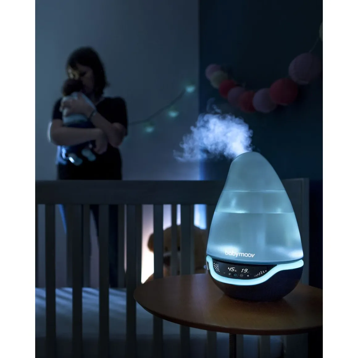 L’humidificateur Hygro + de Babymoov est idéal pour le bien être de votre bébé ! Simple à utiliser, il est équipée d’une technologie ultrasonique silencieuse à vapeur froide avec débit de vapeur réglable (5 niveaux). Silencieux, il humidifie l’air de la chambre de bébé en toute autonomie pour pallier aux désagréments occasionnés par une chambre dont l’air est trop sec. Bébé pourra alors dormir paisiblement dans une chambre saine et agréable. Au design discret et élégant, il s’adaptera parfaitement dans la chambre de votre bout de chou. En plus d’humidifier la chambre de bébé, l’hygro + est une veilleuse multicolore avec 7 couleurs différentes qui permet de rassurer bébé durant son sommeil.