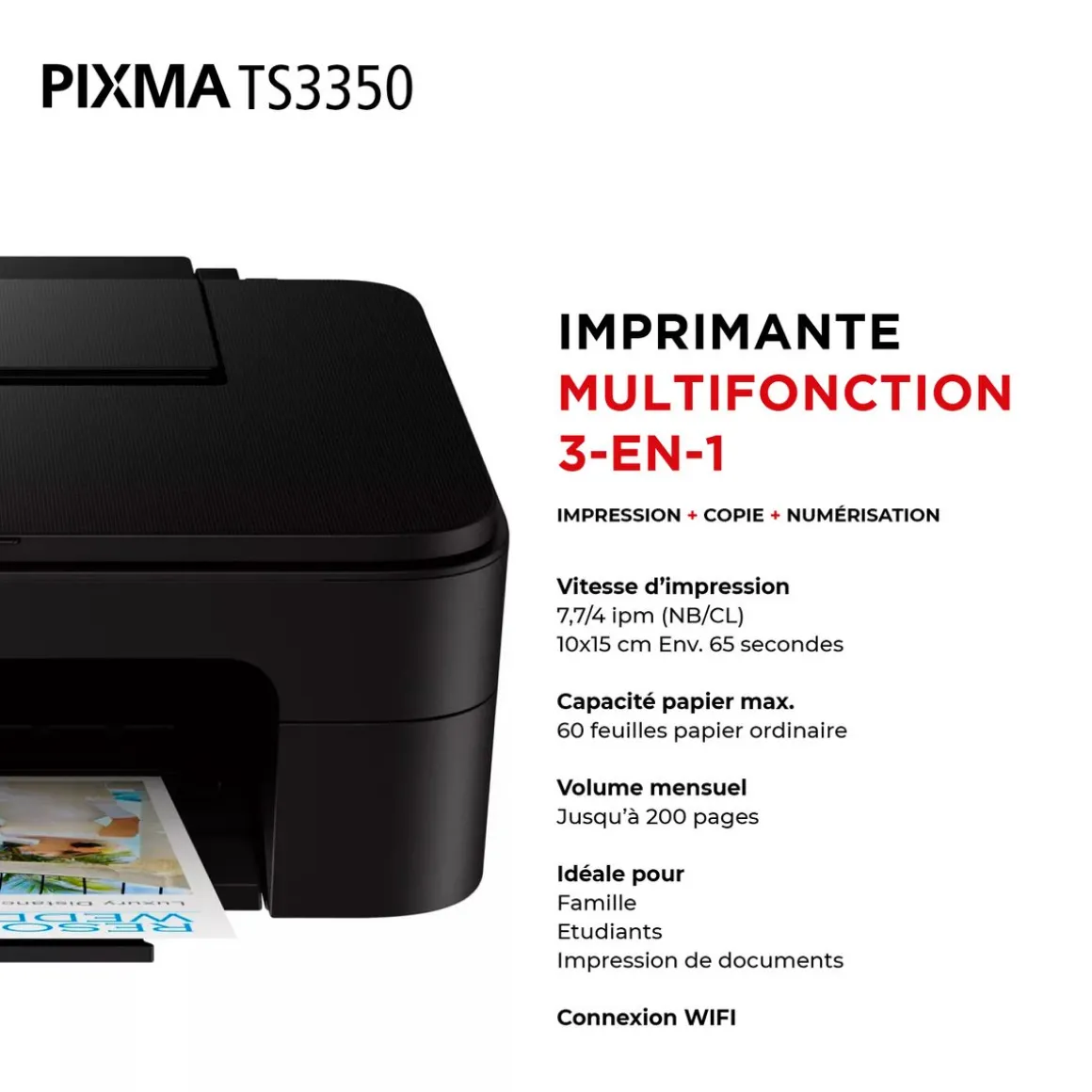 MULTIFONCTION COMPACT & CONNECTÉProfitez d’une connectivité sans fil, d’un écran LCD monochrome de 3,8 cm et des cartouches FINE pour des documents nets et des photos sans marge de qualité avec l’imprimante Canon PIXMA TS3350. Profitez de fonctionnalités multiples et d’une connectivité sans fil optimale. Imprimez, numérisez et connectez-vous au Cloud grâce à l’application Canon PRINT ou imprimez à l’aide d’AirPrint (iOS) et Mopria (Android).
