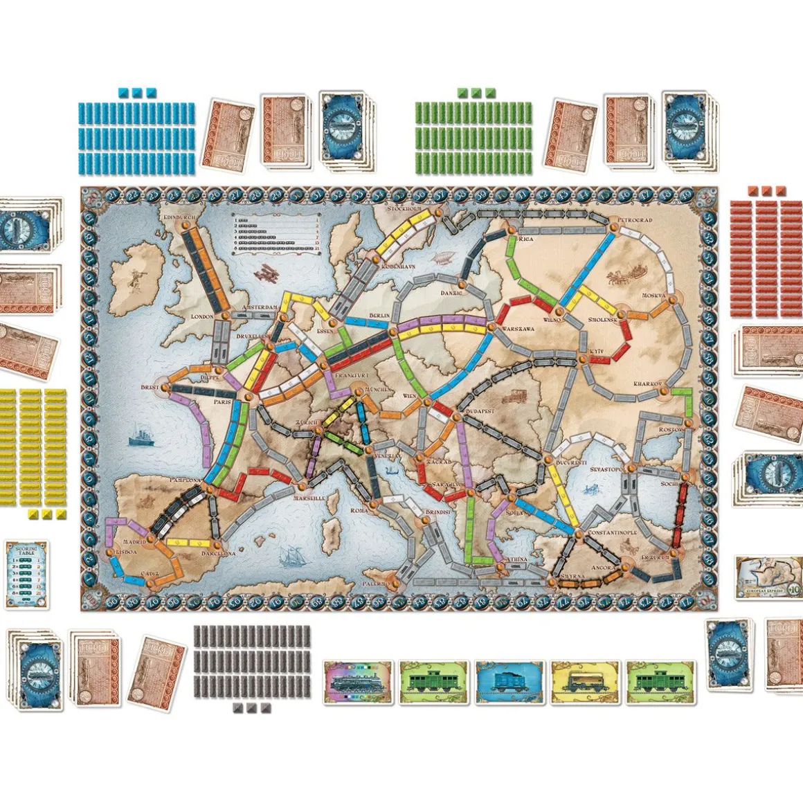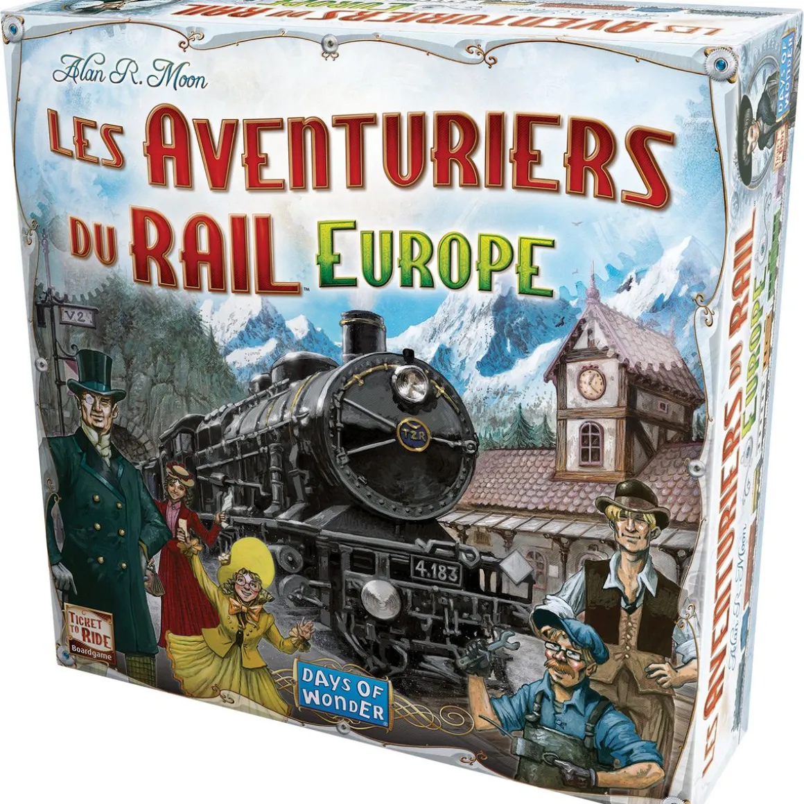 Les Aventuriers du Rail Europe est le deuxième volume de cette collection. Il inclut de nouvelles routes (tunnels et ferries), pièces de jeu, les gares et cartes à jouer grand format. Totalement indépendante, cette édition inclut les règles des tickets longue distance et des gares !