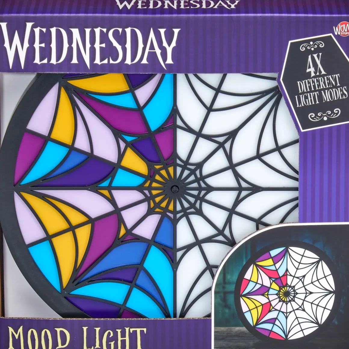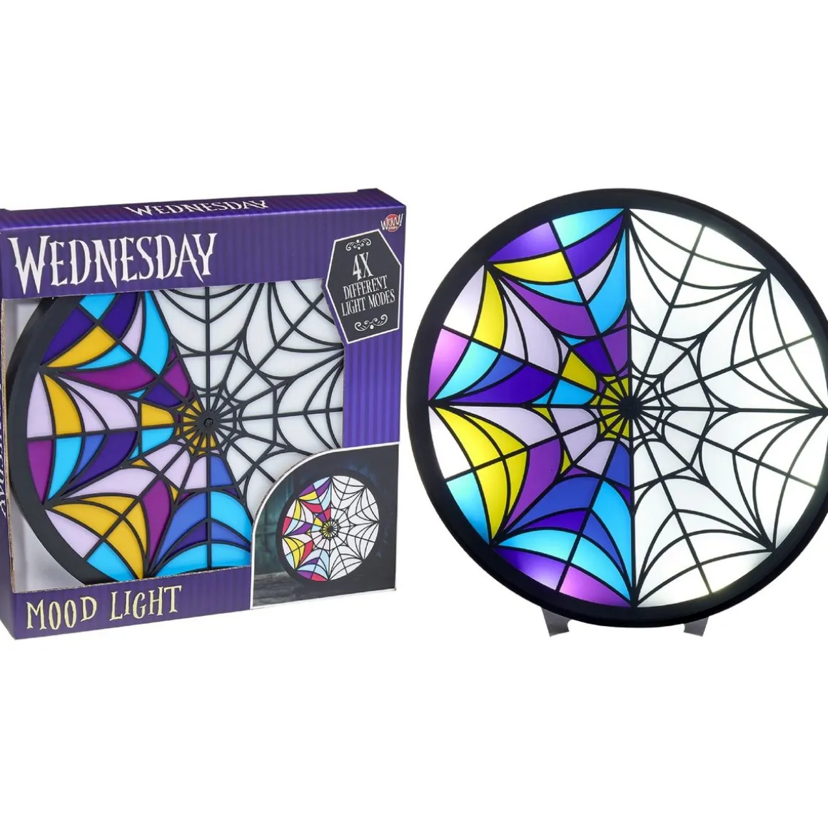 Décore ta chambre avec la véritable reproduction du vitrail de la chambre de Mercredi et Enid ! Fonctionne au choix sur piles (3 piles AAA) ou en branchant le câble USB à une alimentation. 4 modes lumineux pour s’adapter à toutes ses envies, il est possible de n’allumer qu’un côté sur les 2. La lampe fonctionne au choix sur batterie, en se rechargeant via USB, ou sur piles.