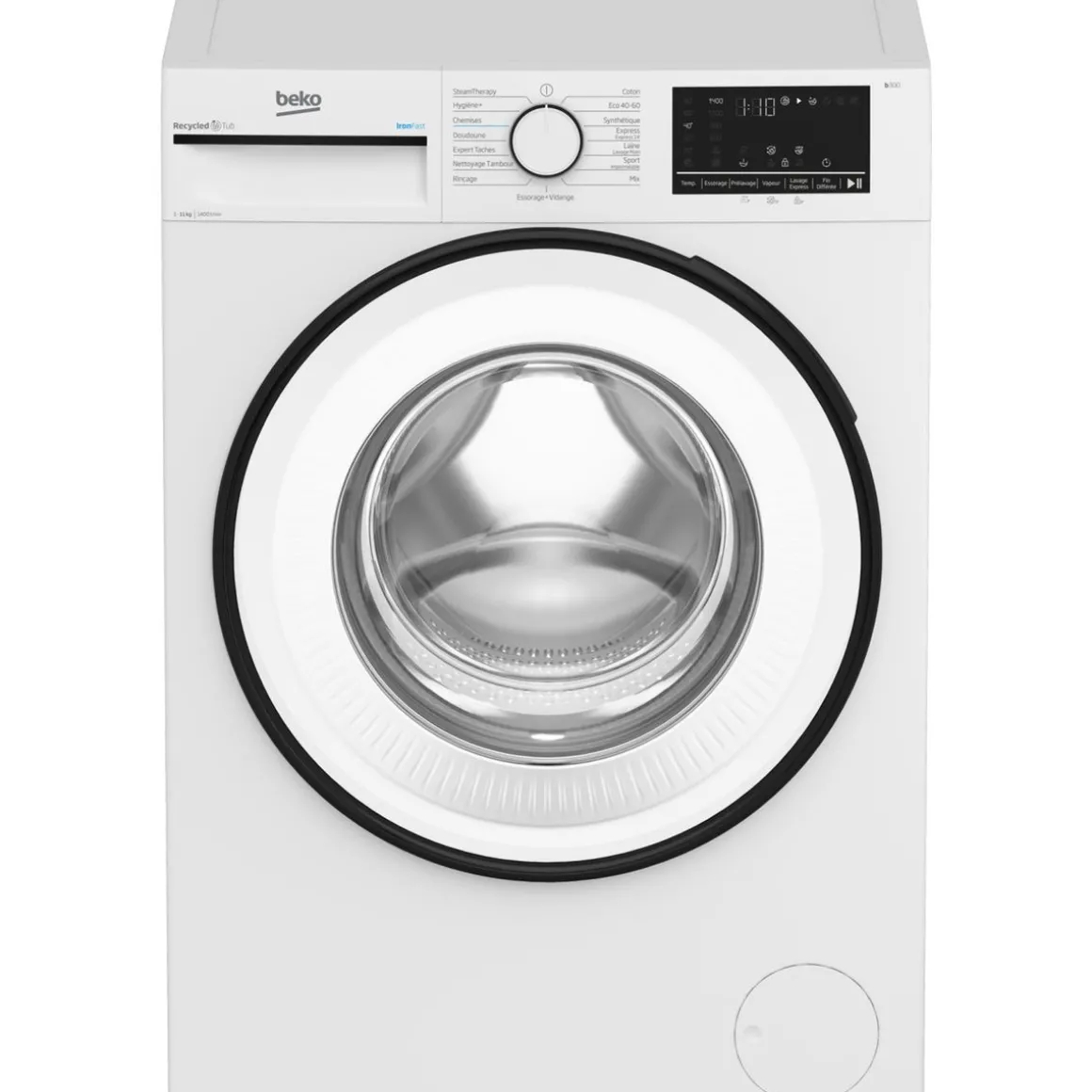 Programmes spéciaux : Express 14′, Essorage + vidange, Rinçage, Nettoyage tambour, Expert taches, Couette/Doudoune, Hygiène+, SteamTherapy.