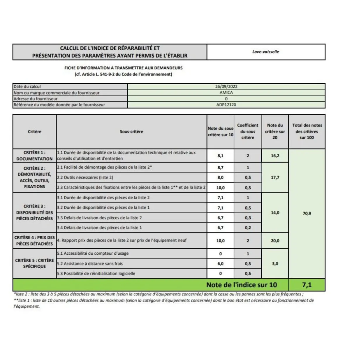 Indice de réparabilité (Note /10) : 7.1.