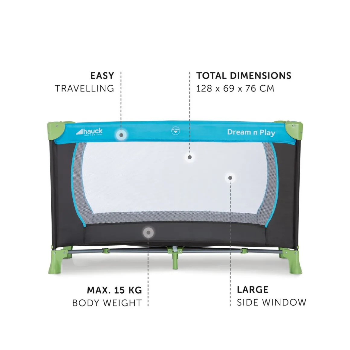 Ce lit parapluie Dream N Play s’utilise de plusieurs façons, faisant de lui un partenaire idéal pour vos vacances, une visite chez les grands-parents ou même pour la maison. Avec son pliage compact, ce lit de voyage peut être transporté simplement partout. Dans ce lit, votre petit trésor dormira tout tranquillement, même en voyage, dès la naissance. À travers les fenêtres en filet l’air circule de manière optimale et vous pouvez garder un œil sur votre enfant en tout moment. En outre, le Dream N Play convient aussi comme parc. Sur une surface de 120 x 60 cm, votre enfant se sentira assurément à l’aise pendant que vous faites le ménage ou vous vous relaxez. Ce lit de voyage se monte et se démonte en quelque geste. Comme ça, vous pouvez le ranger partout et le transporter dans le sac de transport très pratique. Le sac de transport et un fond pliant sont déjà inclus dans la livraison.