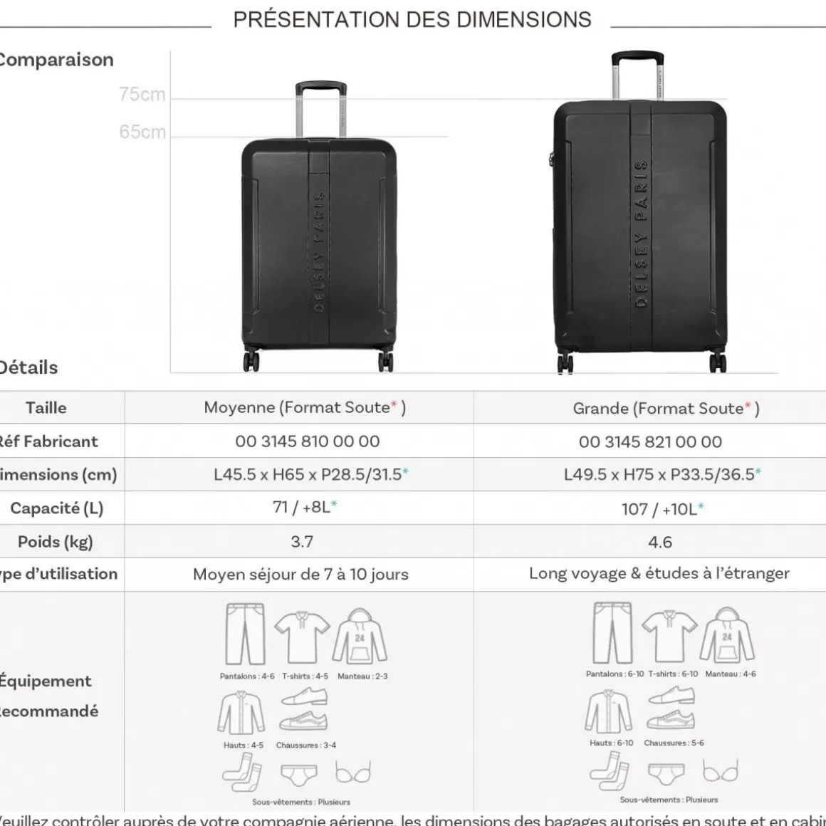 Les dimensions indiquées sont les dimensions extérieures des bagages, comprenant poignées, roulettes, pieds, poches latérales et autres éléments extérieurs.